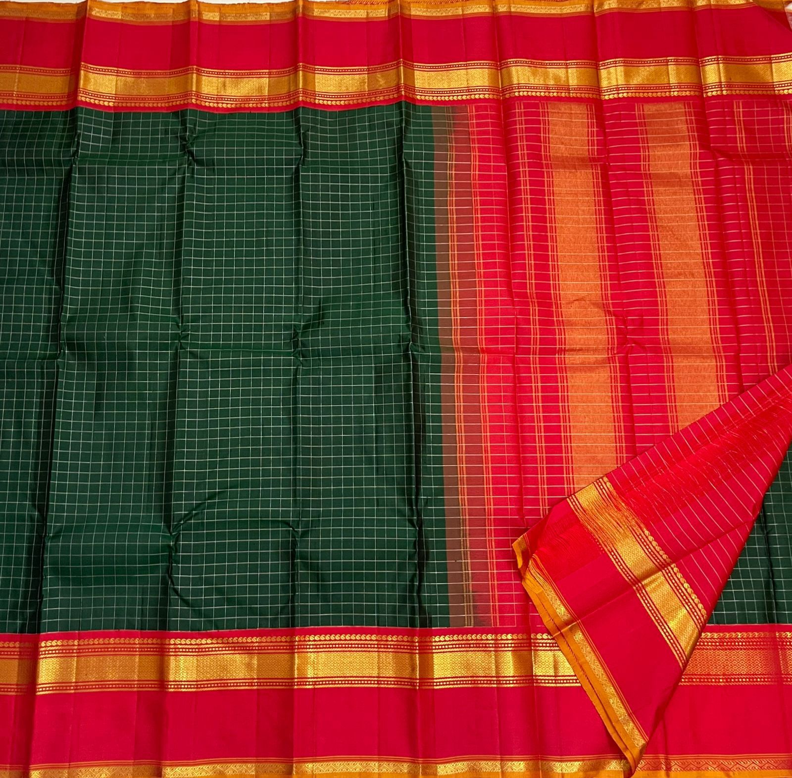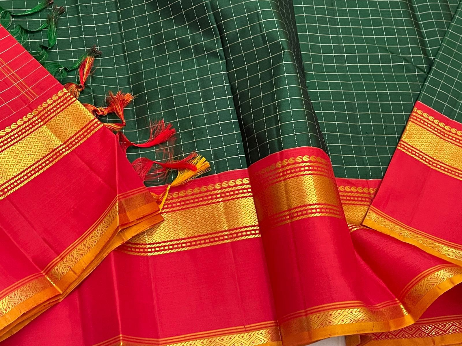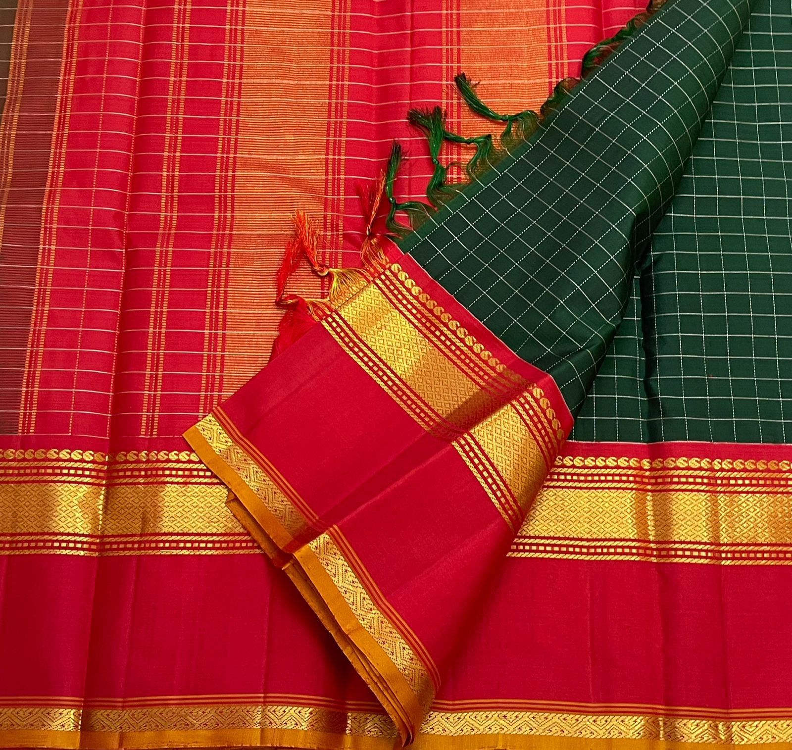 Verdant Blaze Korvai – Pure Silk Kanchipuram Saree Deep Green Checked Body with Contrast Red Border ✨ Mustard Selvedge Highlight for a Striking Edge 🌼 Rich Gold Zari Borders & Traditional Korvai Weave 💛 Silk Mark Certified | ships in2 weeks
