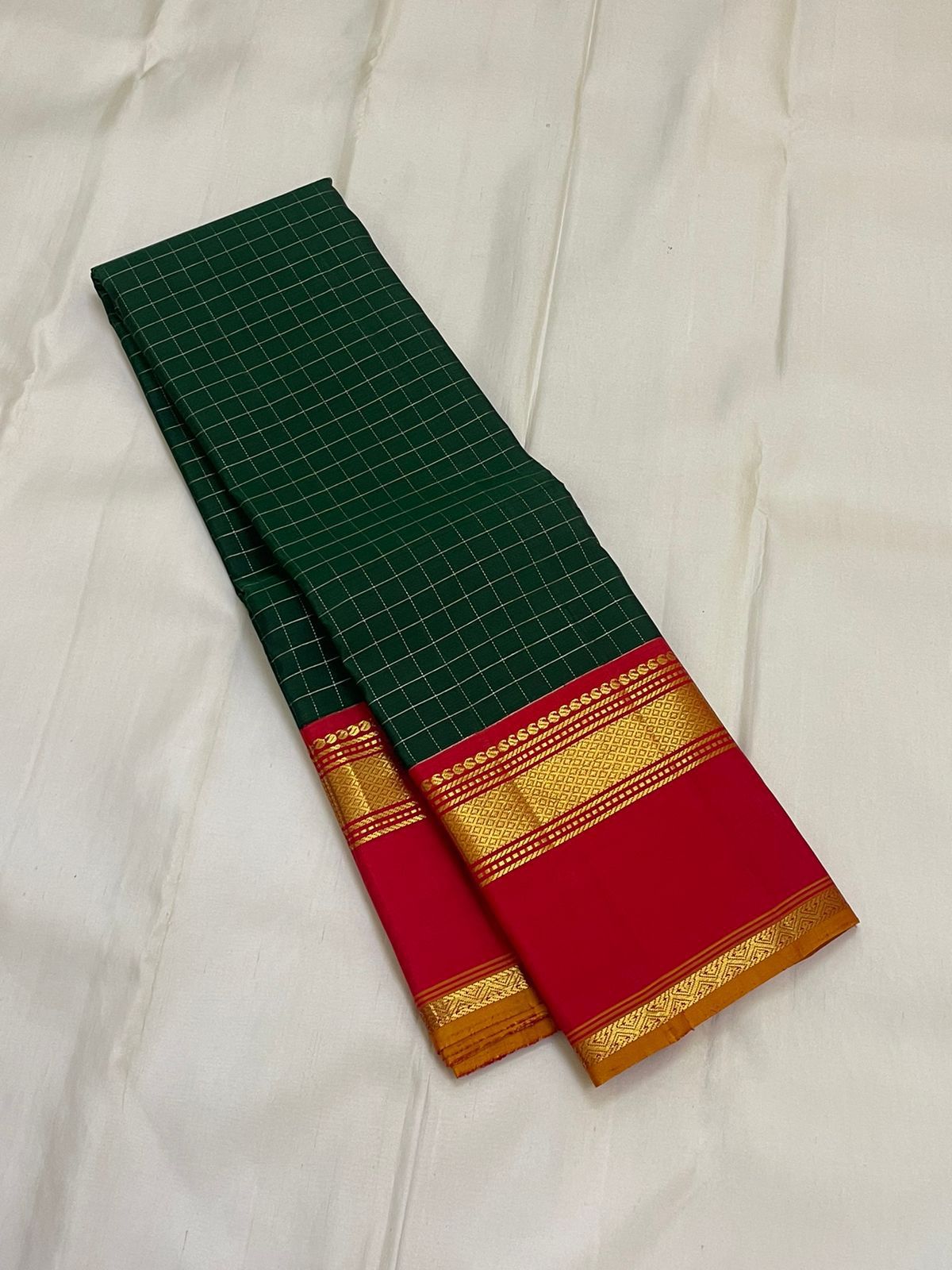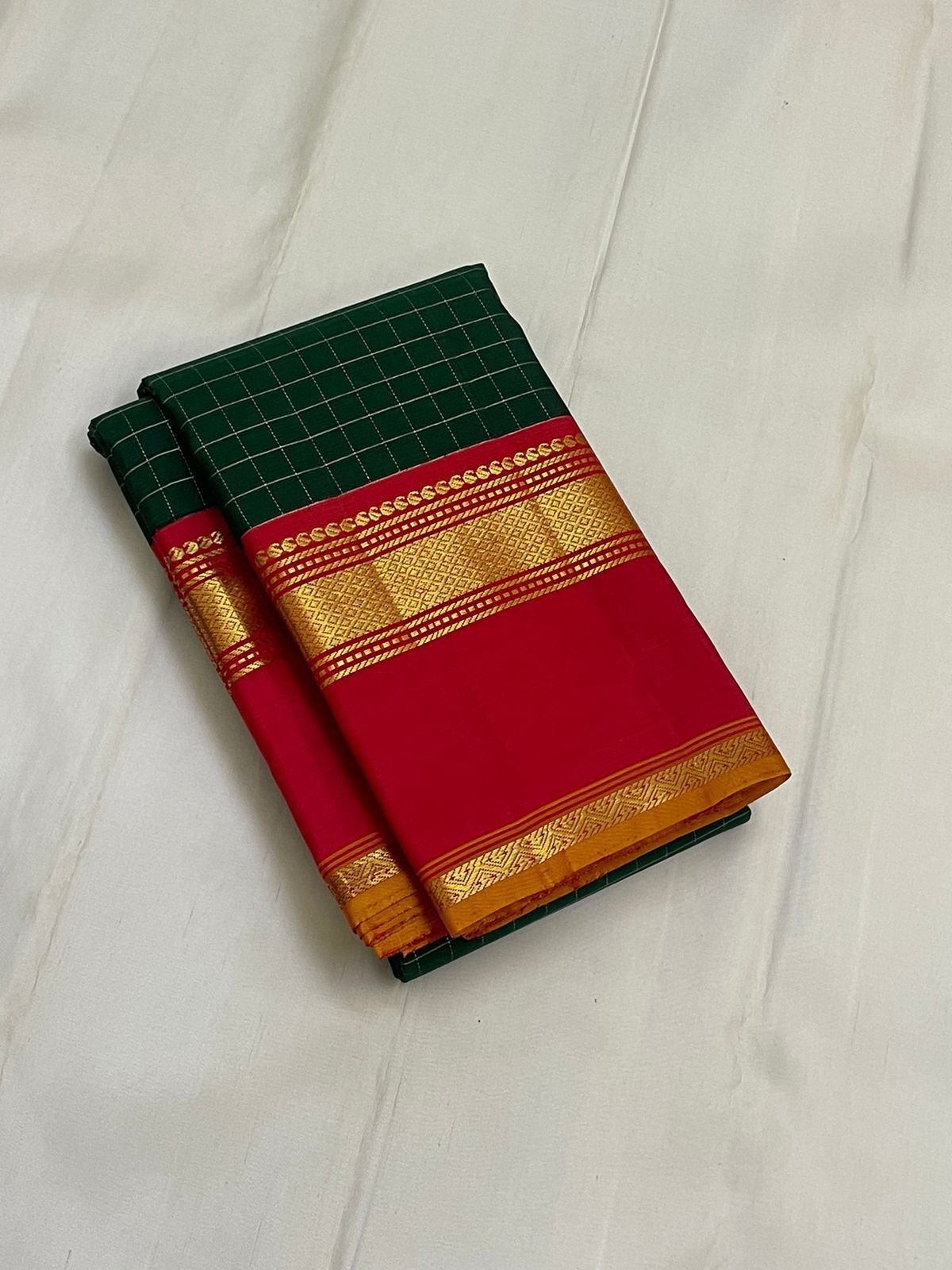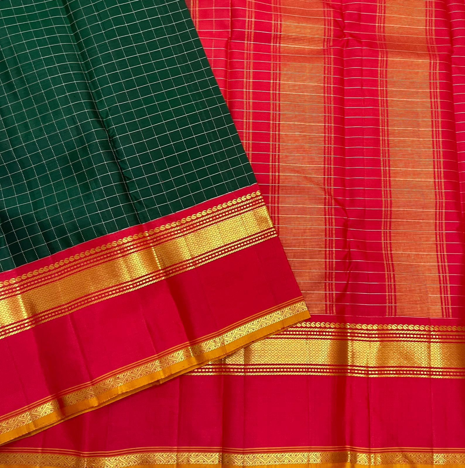 Verdant Blaze Korvai – Pure Silk Kanchipuram Saree Deep Green Checked Body with Contrast Red Border ✨ Mustard Selvedge Highlight for a Striking Edge 🌼 Rich Gold Zari Borders & Traditional Korvai Weave 💛 Silk Mark Certified | ships in2 weeks