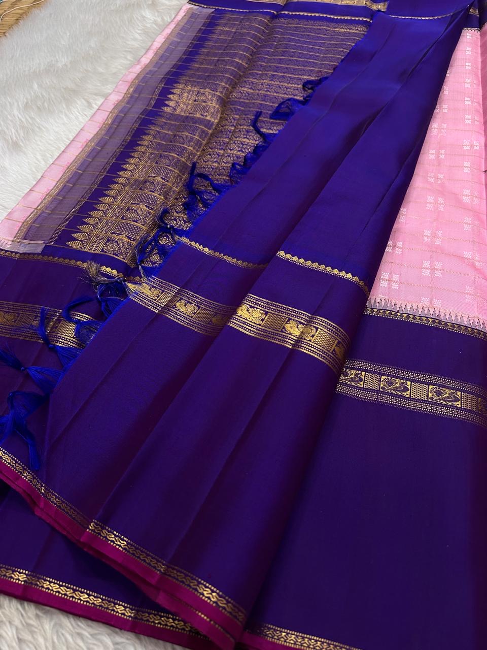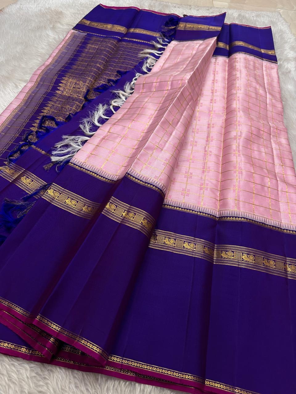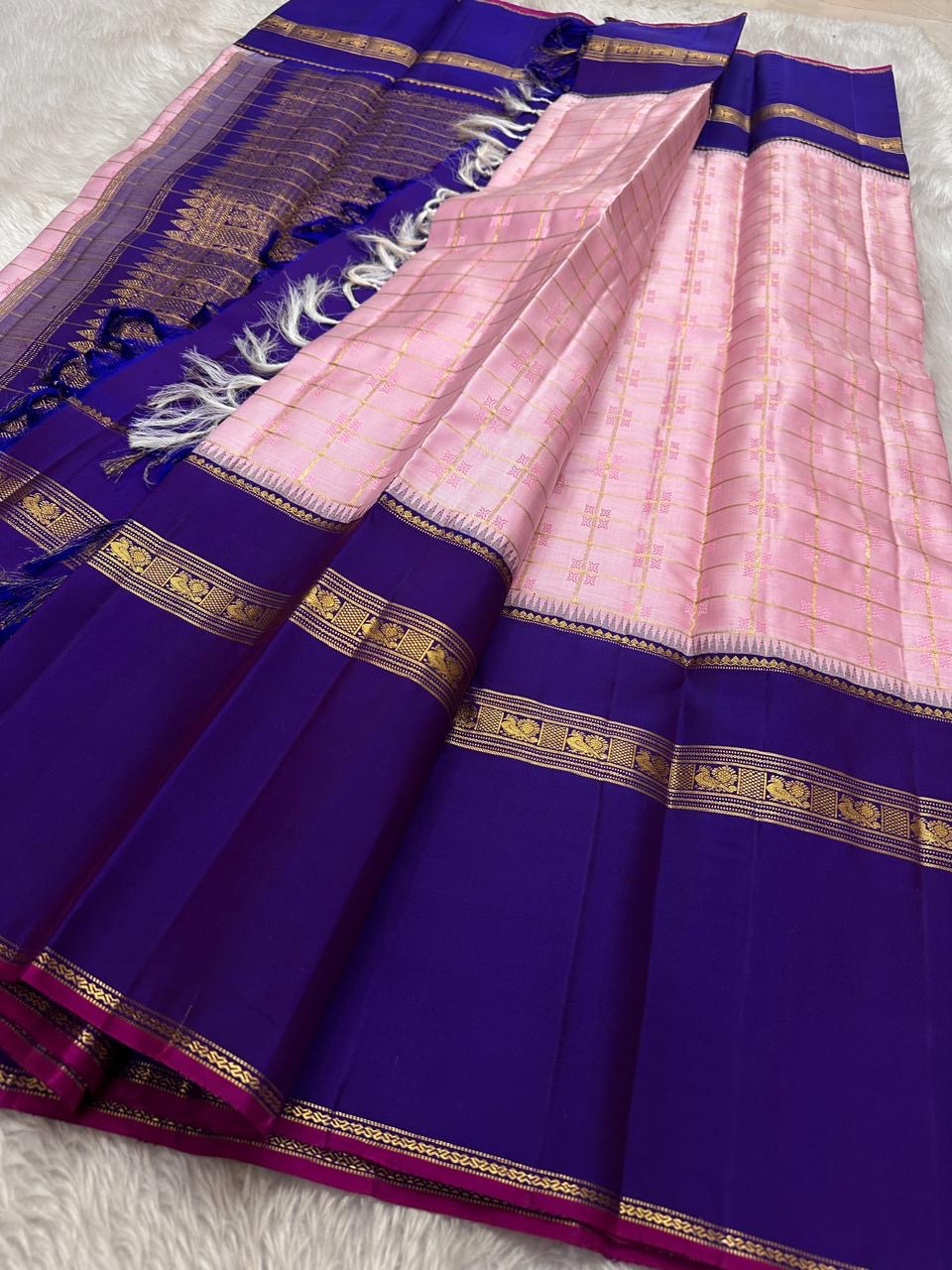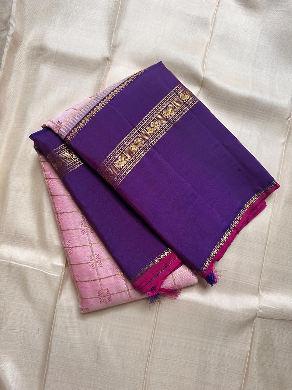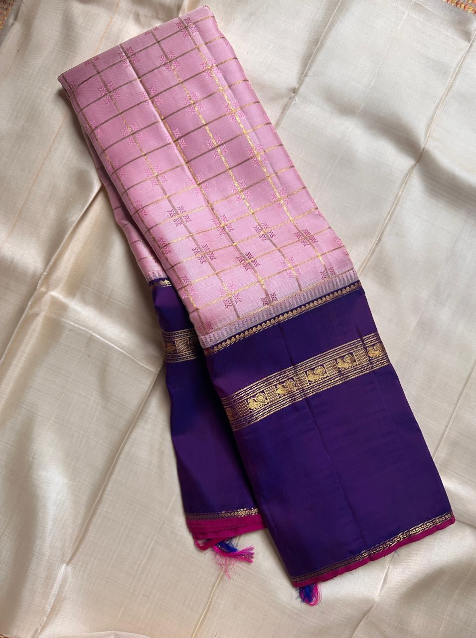 A serene petal-pink body, delicately mapped with gold grid checks (kattam) and tiny floral buttas, meets a regal vadamalli purple border and pallu. Gold zari panels, magenta selvedge, and a luminous brocade pallu add festive glow—perfect for Diwali pujai, Karthigai Deepam, weddings, receptions, and sangeets.