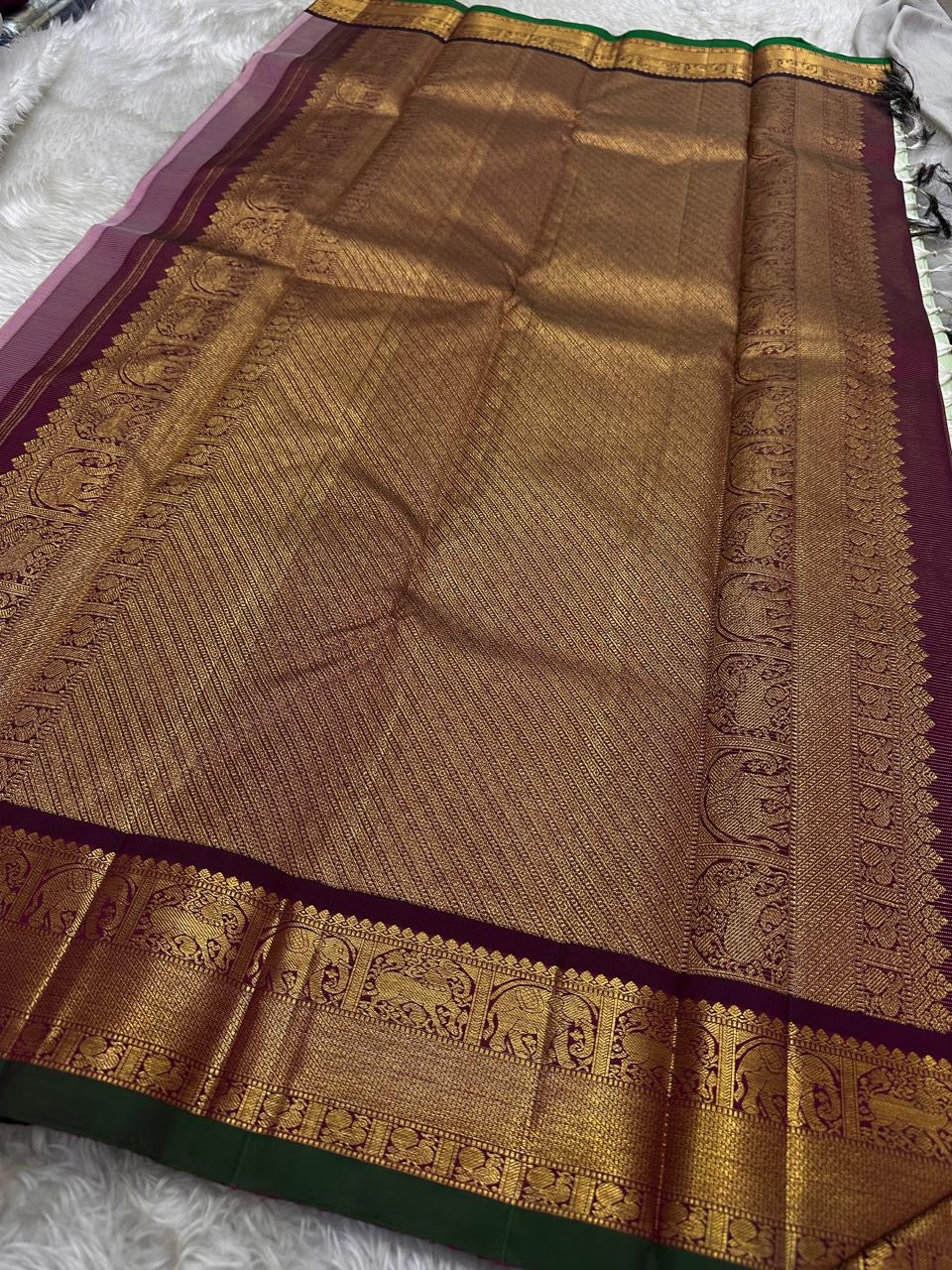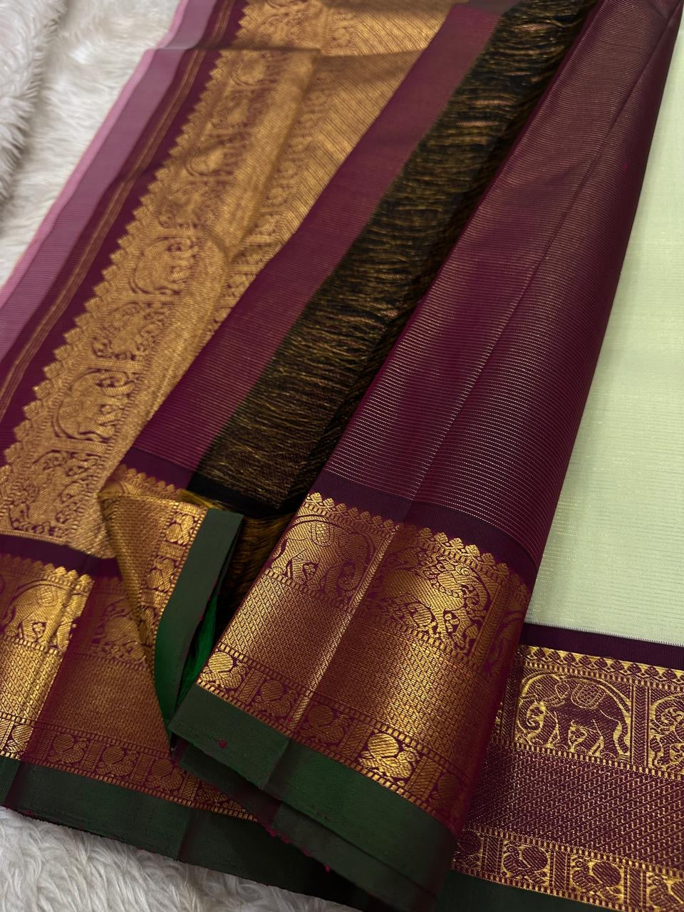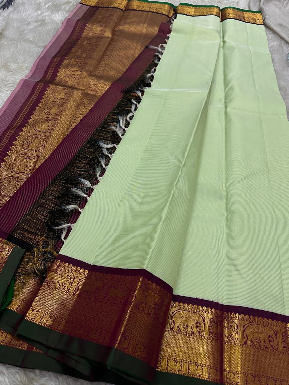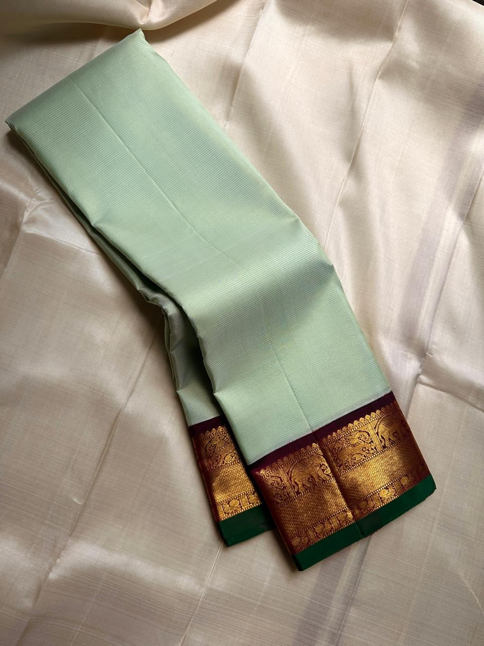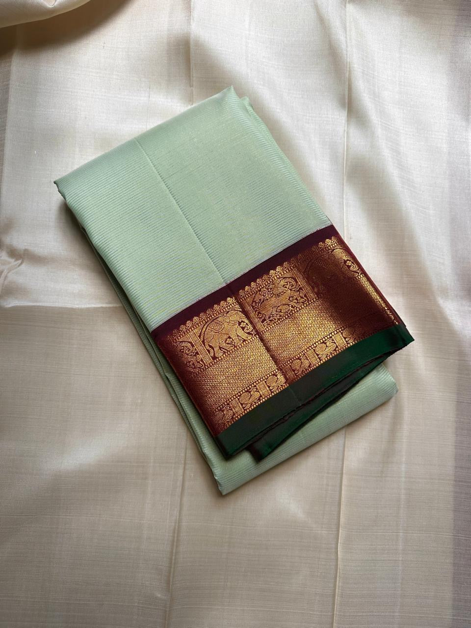 Pistachio Mist brings a calm, temple-day elegance—soft pistachio/mint green body that feels airy and modern, anchored by a wine-maroon korvai border and deep-green selvedge. The regal elephant panels add auspicious charm.