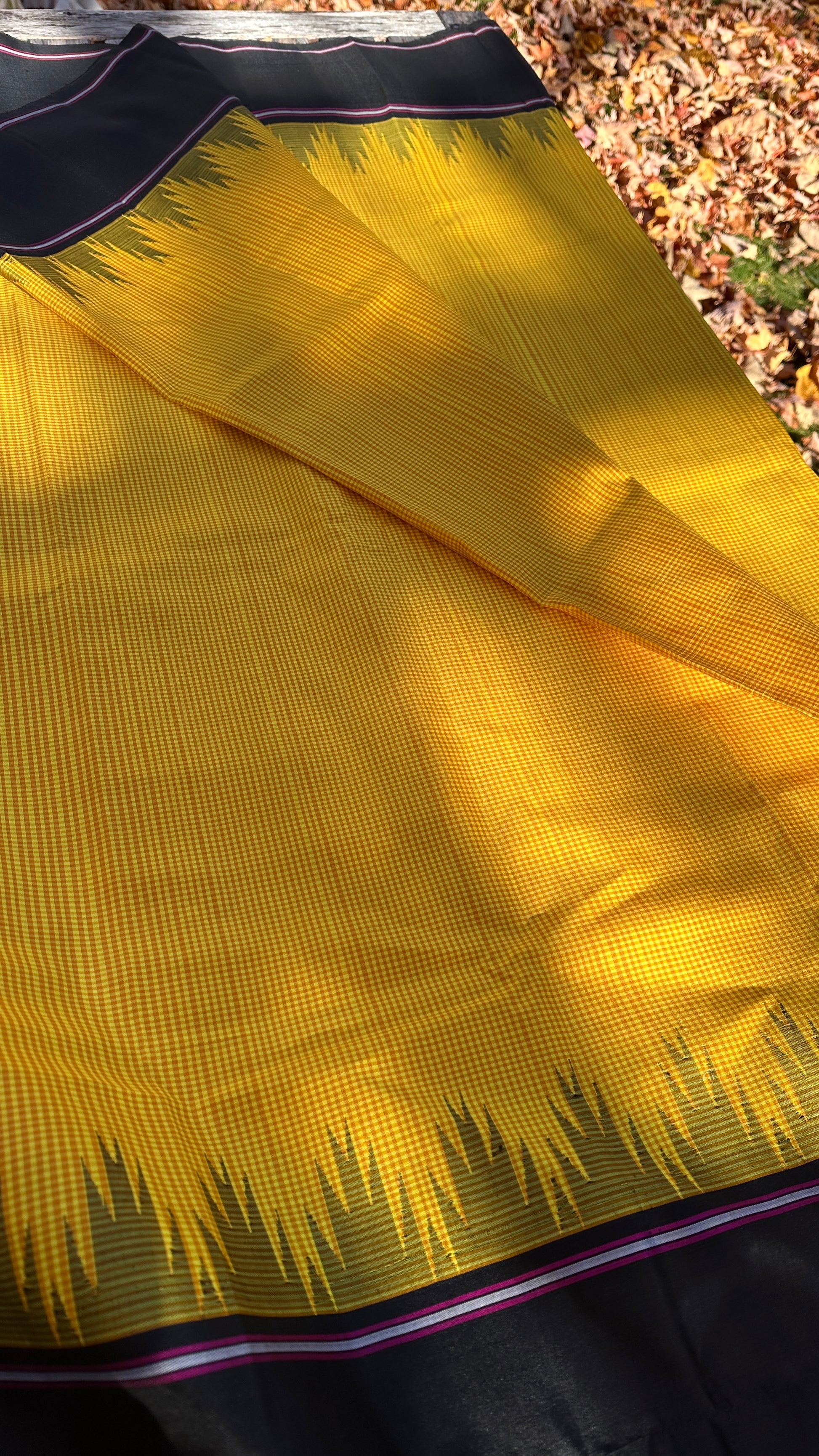 The saree features a harmonious blend of sunlit yellow and warm biscuit brown kattam checks, creating a rustic yet elegant pattern that radiates classic charm. The design is elevated by a bold black border, offering a striking contrast that frames the drape with grace and sophistication. Ideal for festive gatherings, cultural events, or heirloom collections, Ravina beautifully balances tradition with a touch of modern drama.
