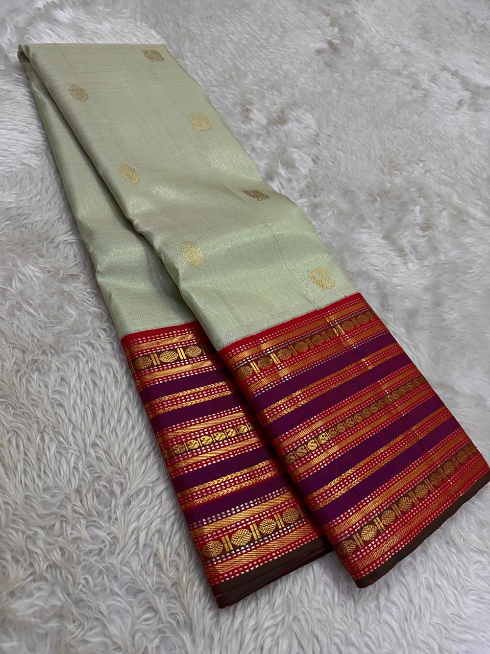 View comparePure silk kanchipuram grey with sampanga green vairaoosi with detailed ornate varisaipet border thandavalam zari , mayil Butta
