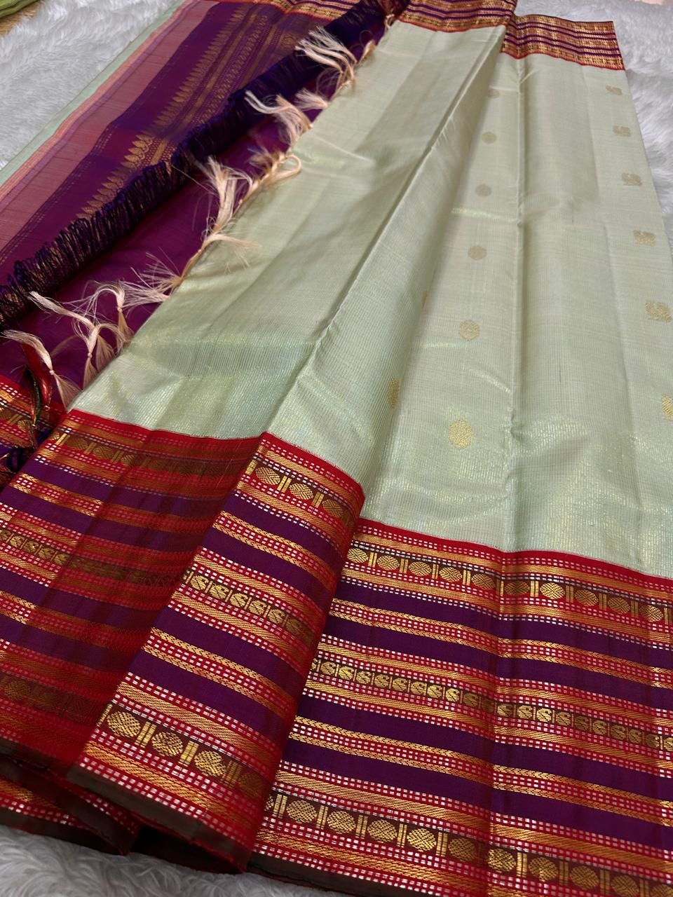 Woven with heritage, this masterpiece blends a subtle grey–pistachio green Vairaoosi body adorned with delicate Mayil buttas. The highlight is the grand Varisaipet border in rich purple and red, detailed with Thandavalam zari patterns that radiate temple artistry. A resplendent zari brocade pallu completes the drape, making it a timeless heirloom.