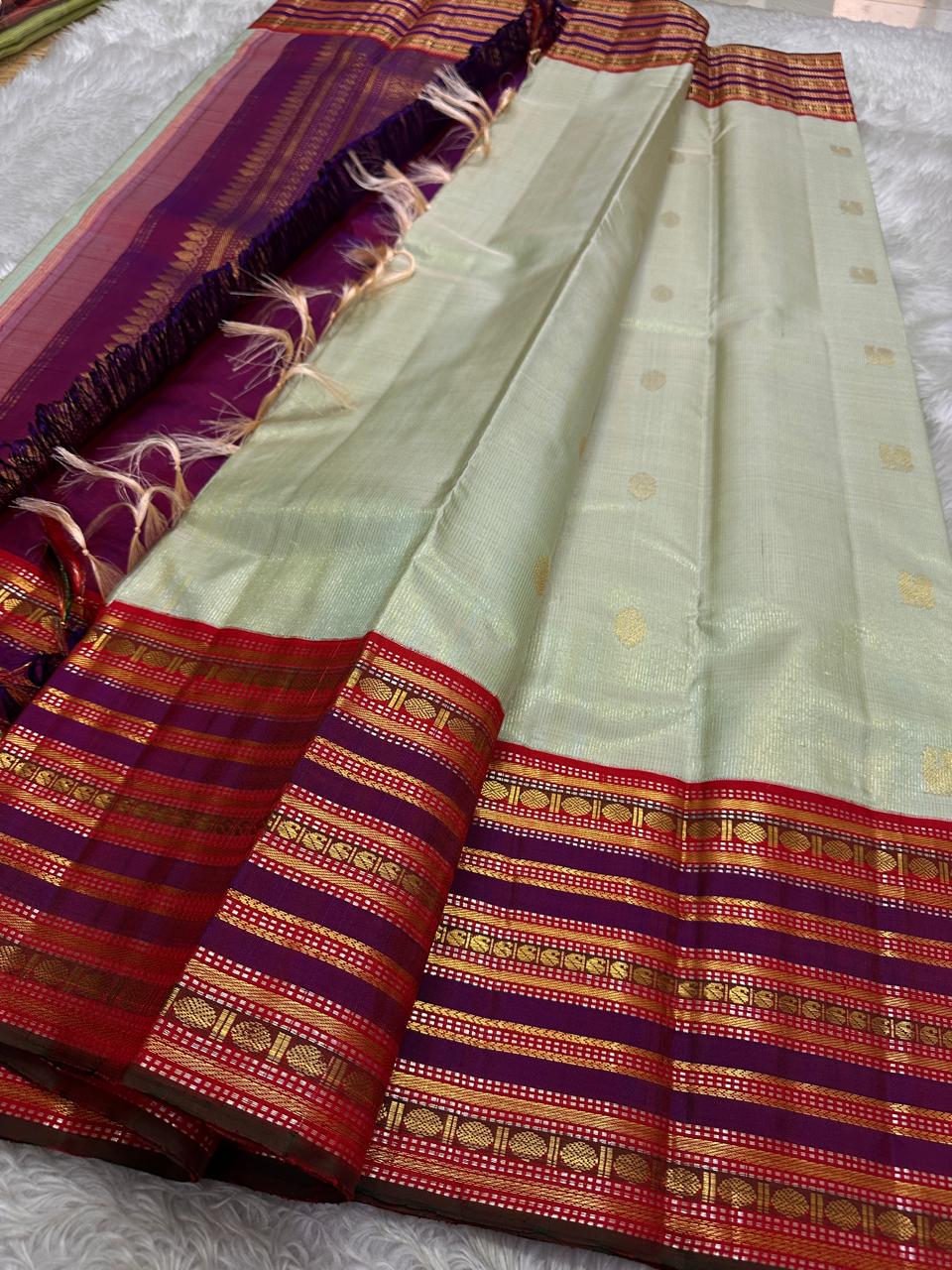 - Body – Elegant grey with a pistachio green undertone, woven in fine Vairaoosi stripes with golden Mayil (peacock) buttas.