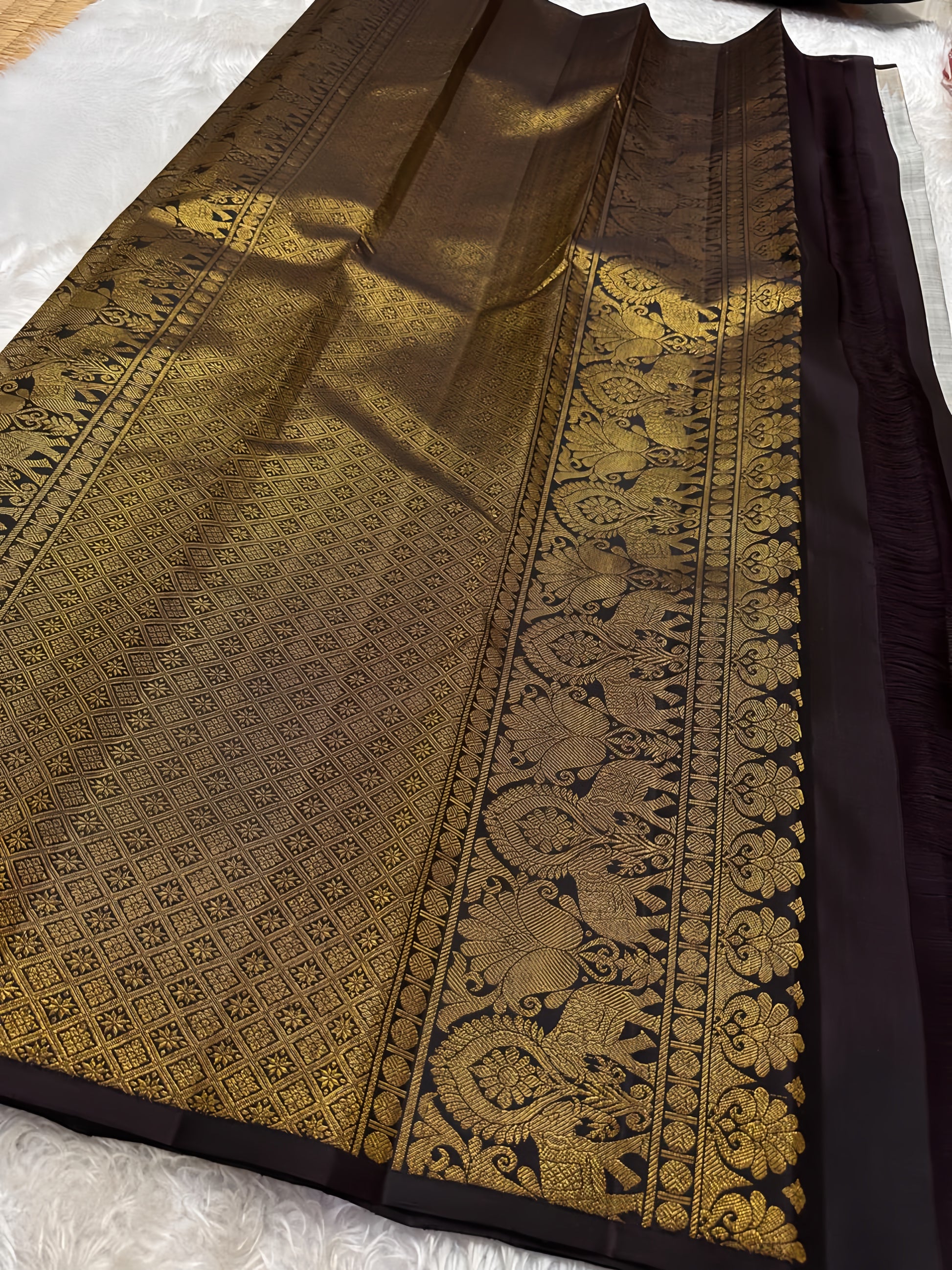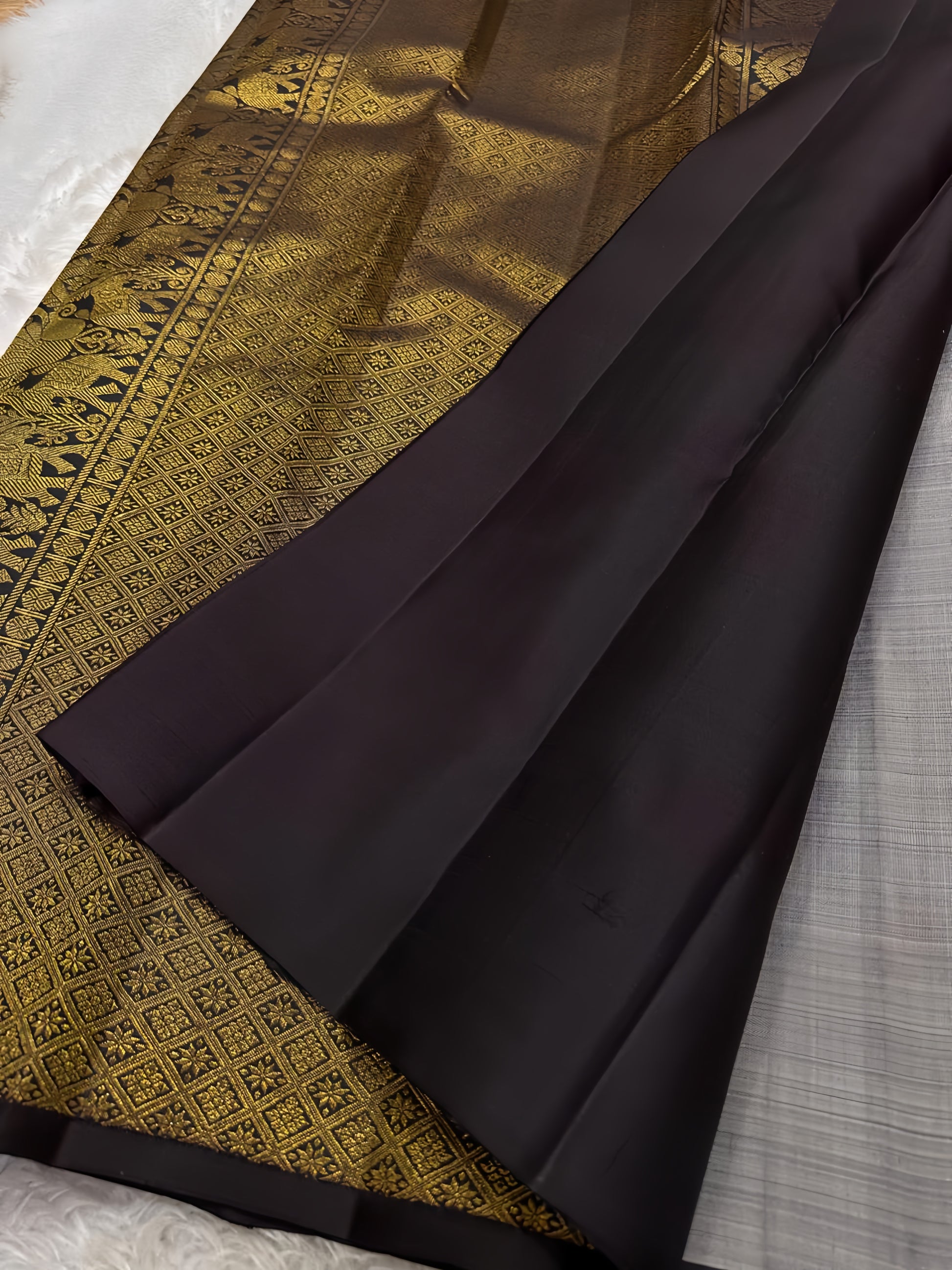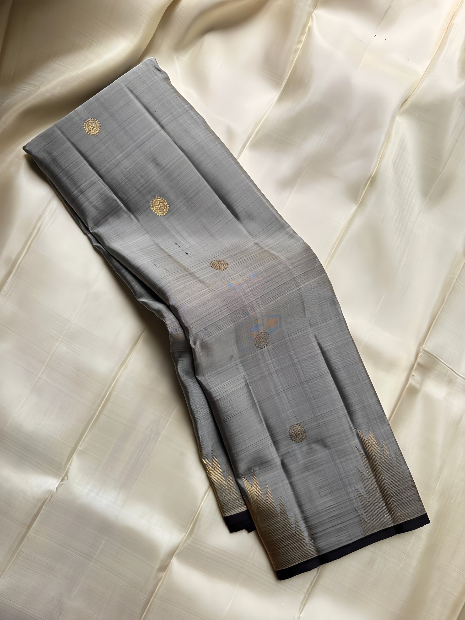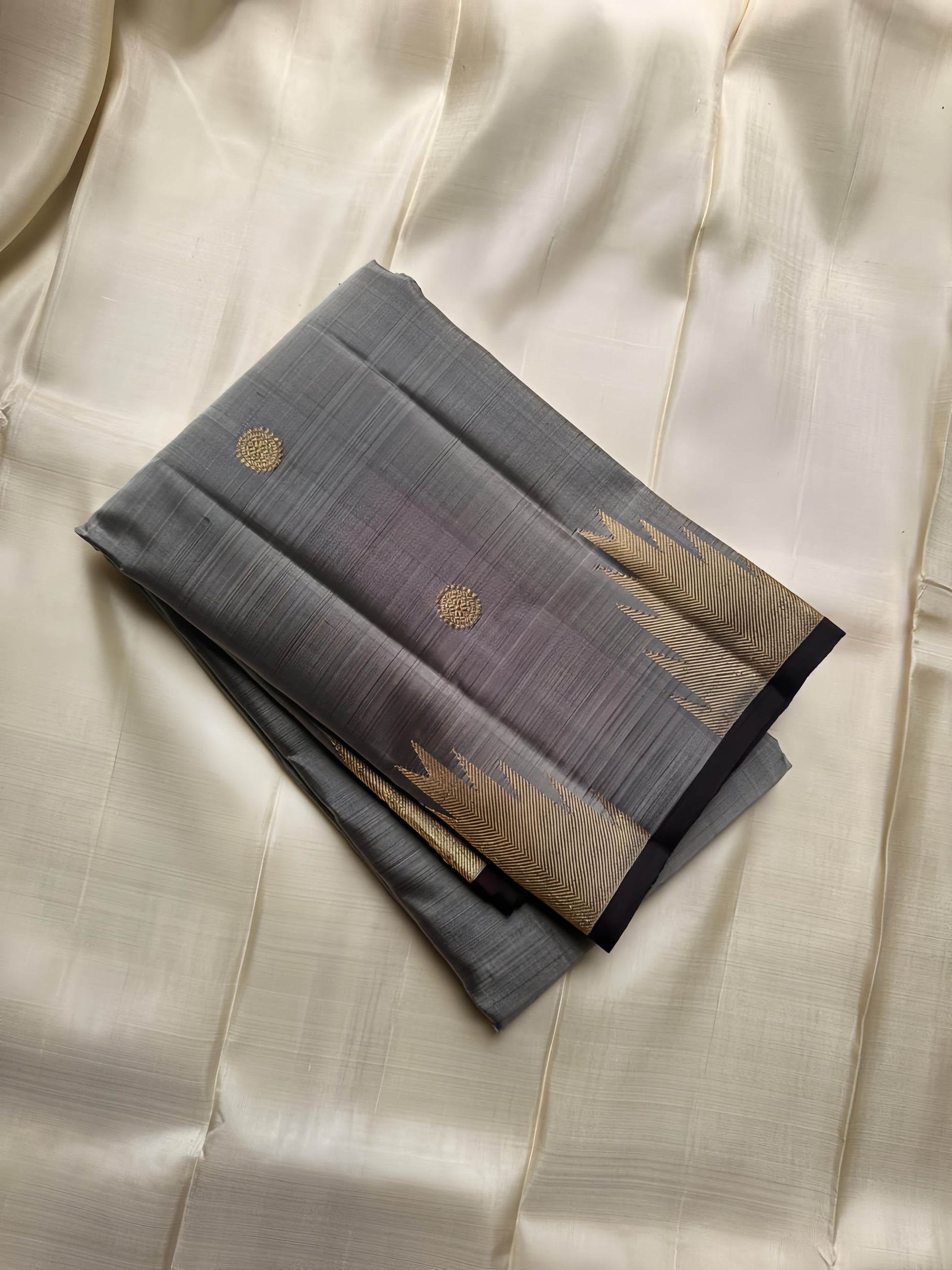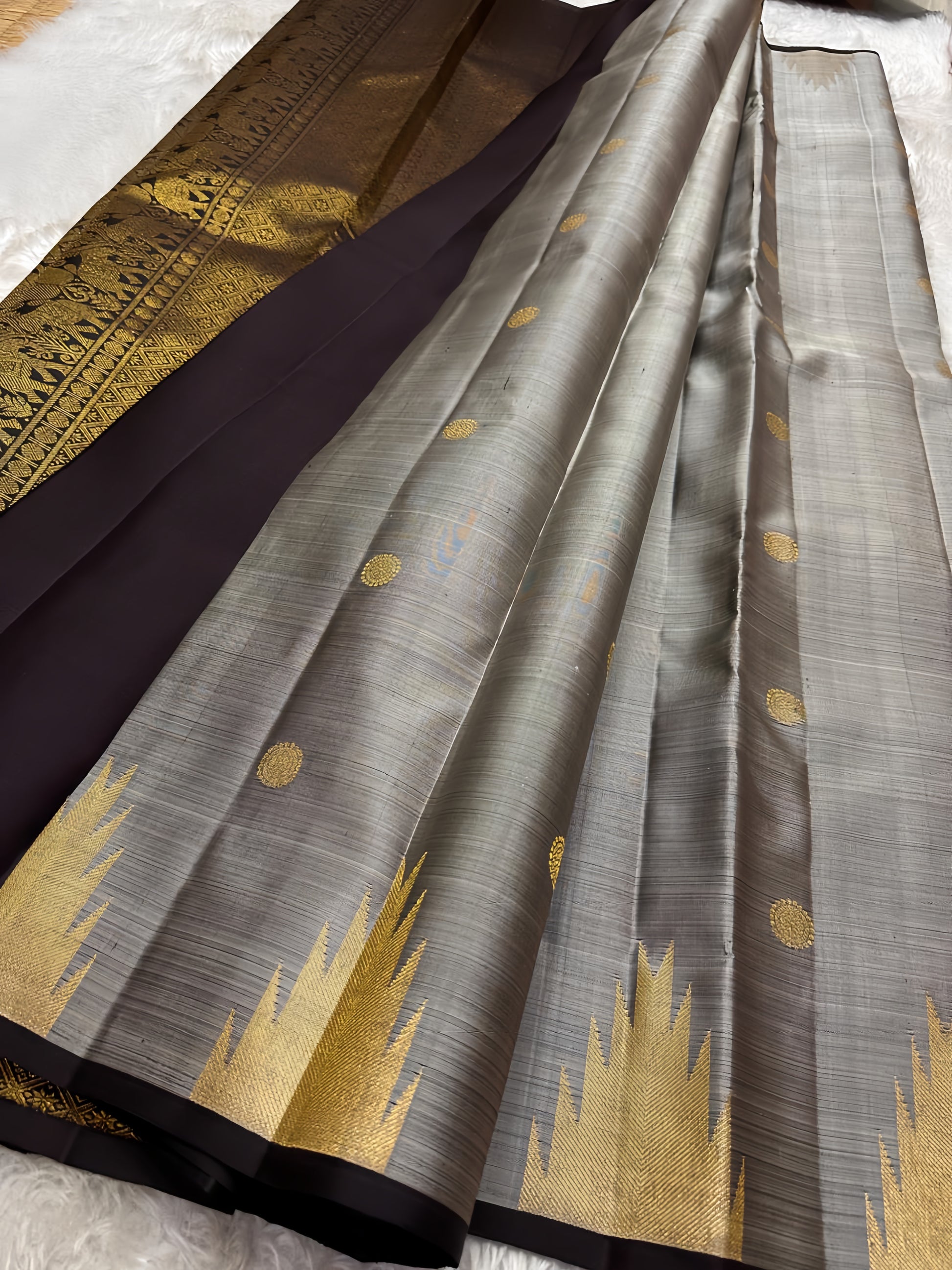 Pure silk kanchipuram grey with zari thazhampoo reku darkest brown or podi color selvedge and Pallu