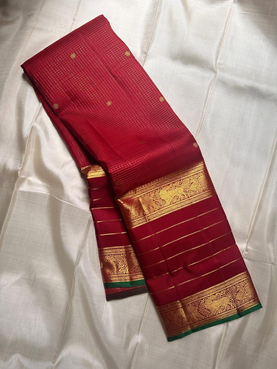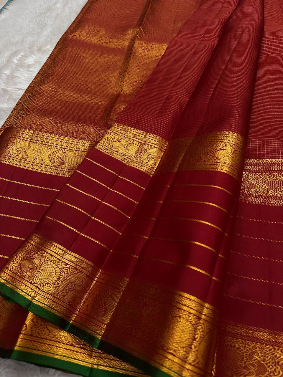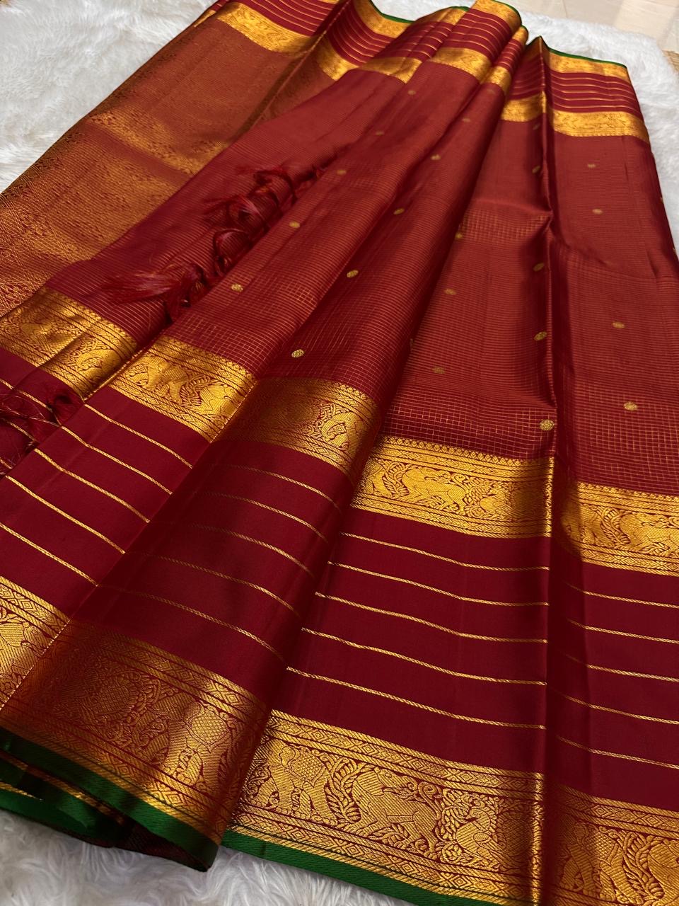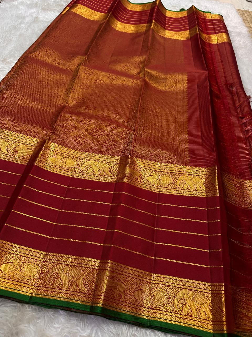 Pure silk kanchipuram maroon Zari kattam with butta rettapet border with Zari stripes intricate pallu with green selvedge “ restocked on demand “