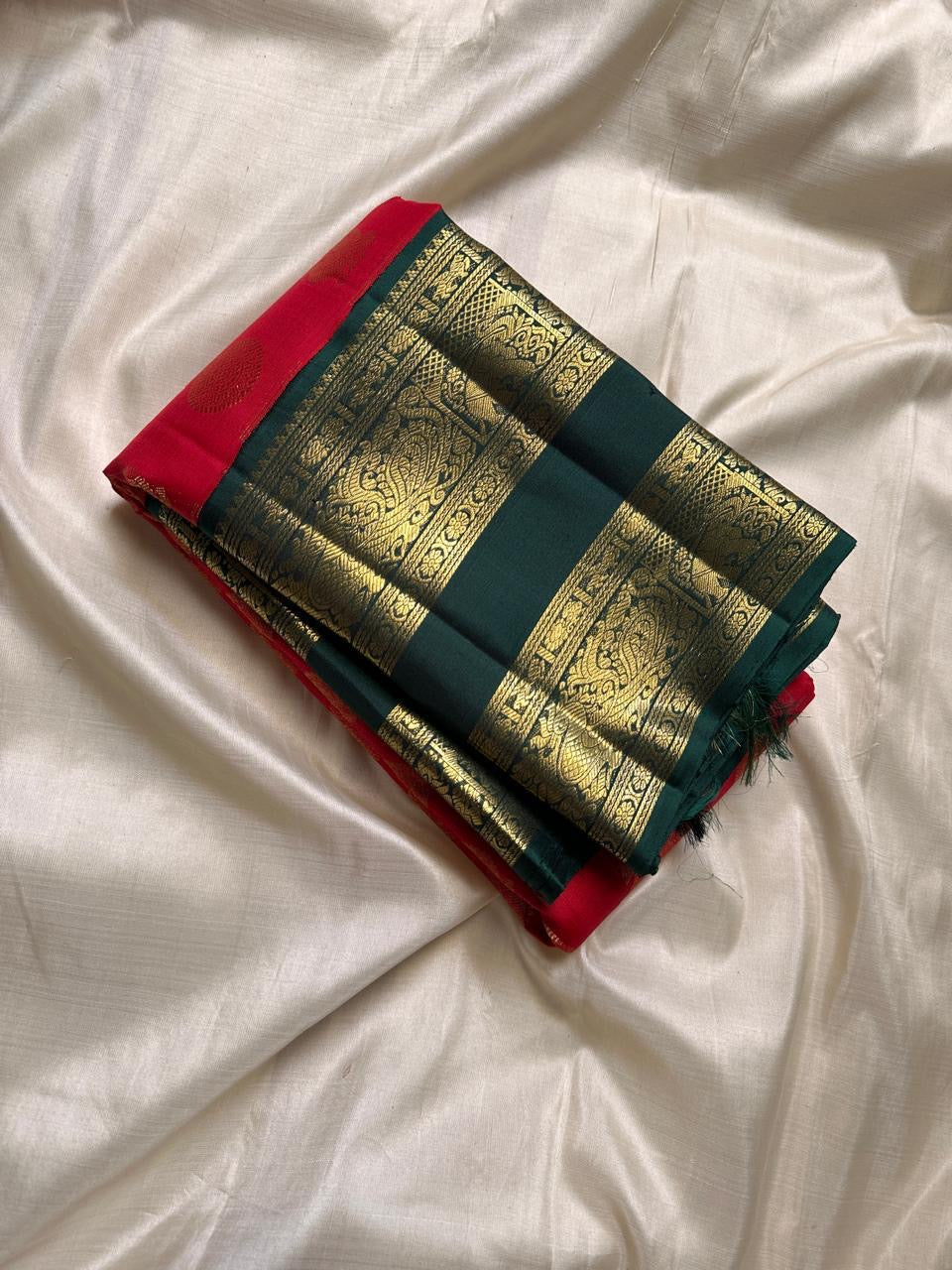The body glows in a striking 🍅 tomato red hue — rich and fiery, reminiscent of sacred lamps lit during celebrations 🪔. It is adorned with mayil (🦚 peacock) and chakram (⚙️ disc) buttas — ancient symbols of beauty and cosmic harmony — spread gracefully across the silk canvas.