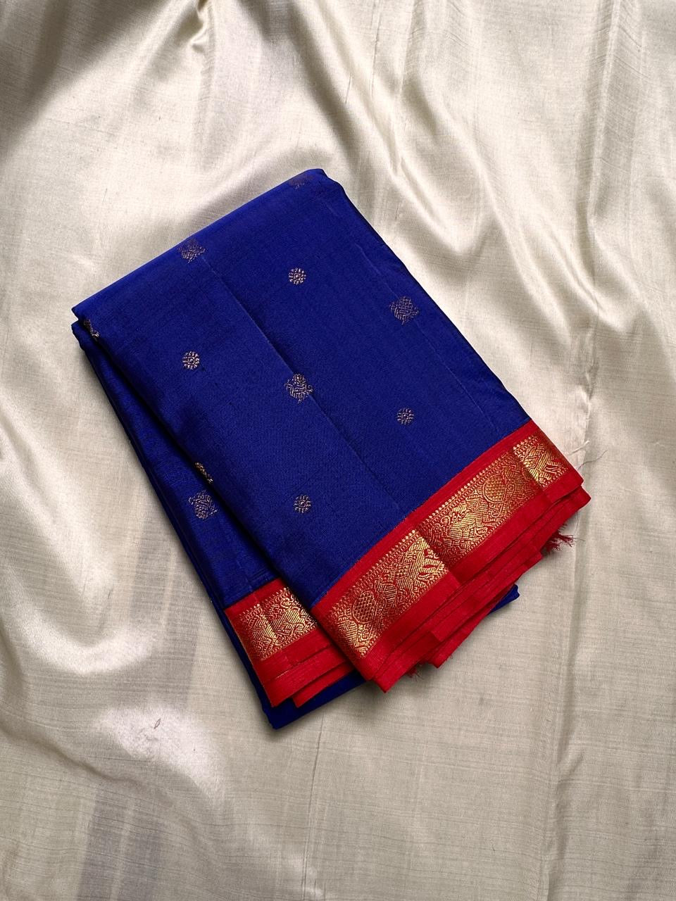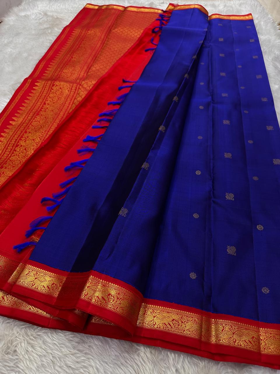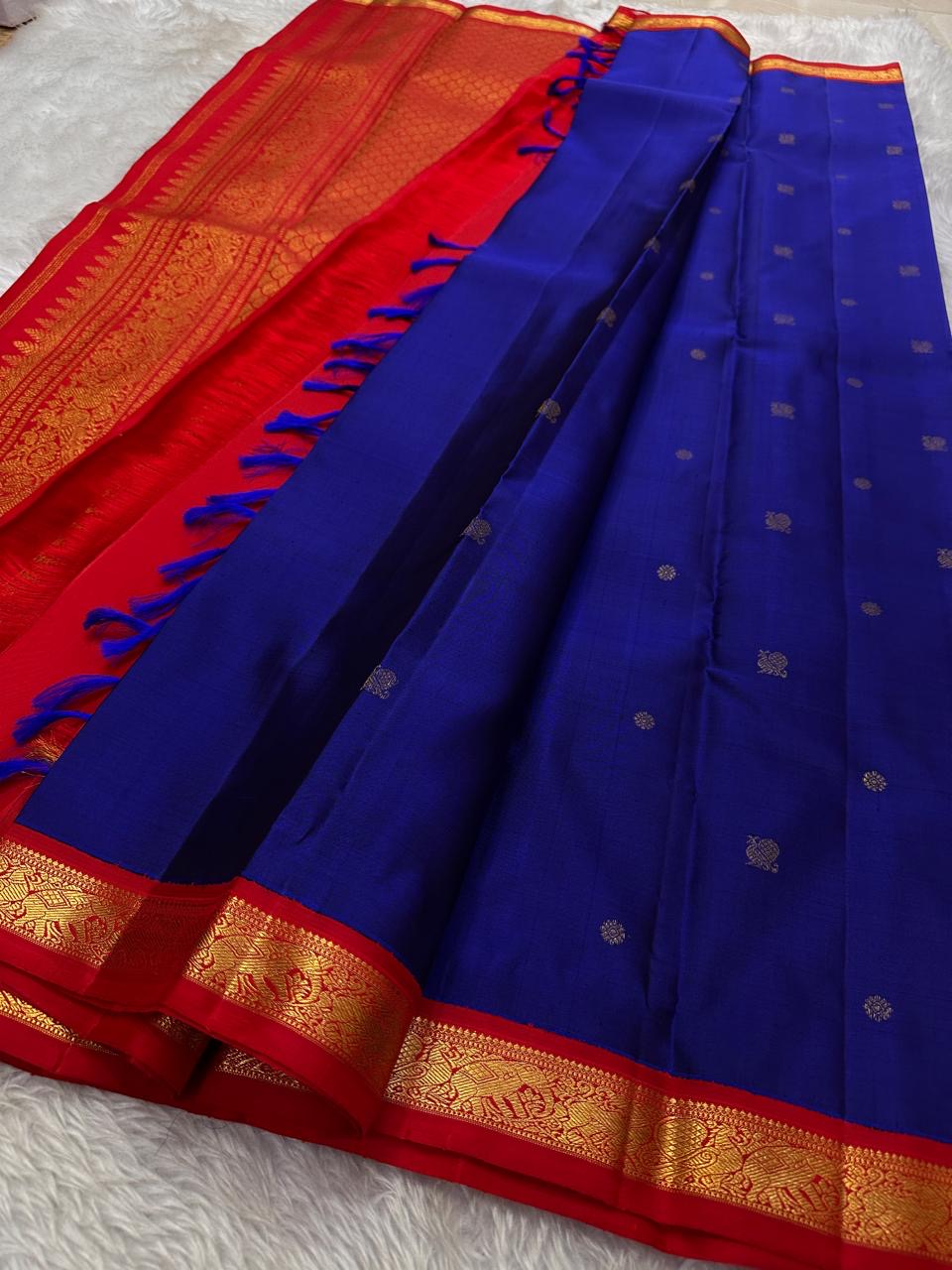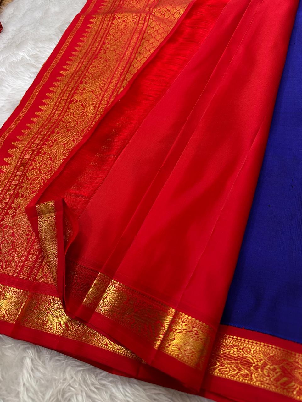 Bold, graceful, and rooted in tradition, Neerja is a celebration of contrast and craftsmanship. Woven from pure Kanchipuram silk and certified by the Silk Mark, this saree features a luxurious ink-toned royal blue body (MS Blue) that radiates depth and elegance.