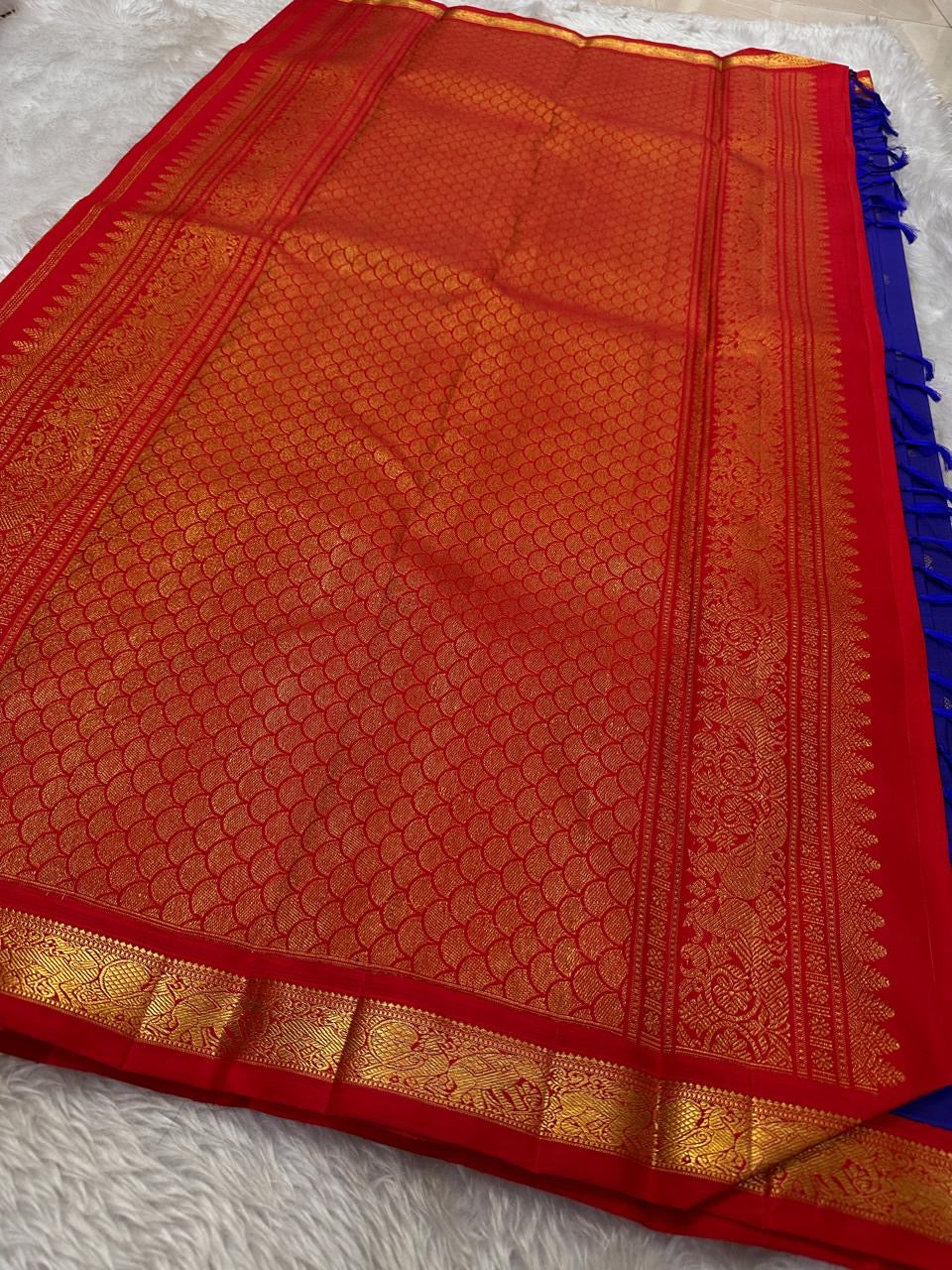 Neerja – MS Blue & Flaming Orange Kanchipuram Pure Silk Saree with Vanasringaram Motifs, Petite Border & 3G pure zari