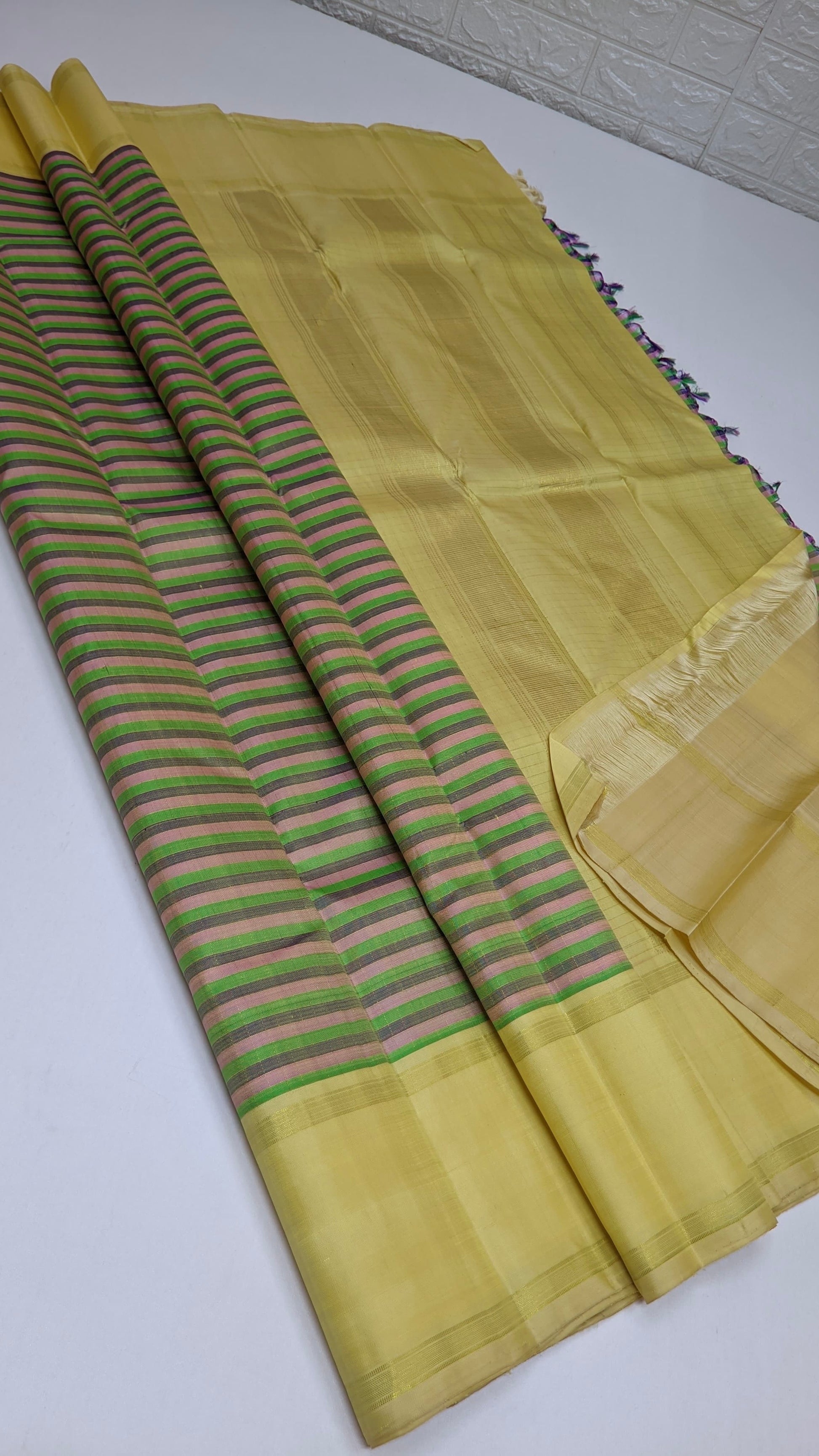 Pure silk kanchipuram saree cream border with pastel stripes all over body