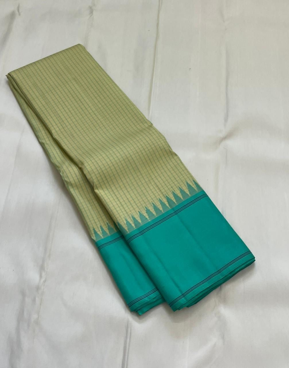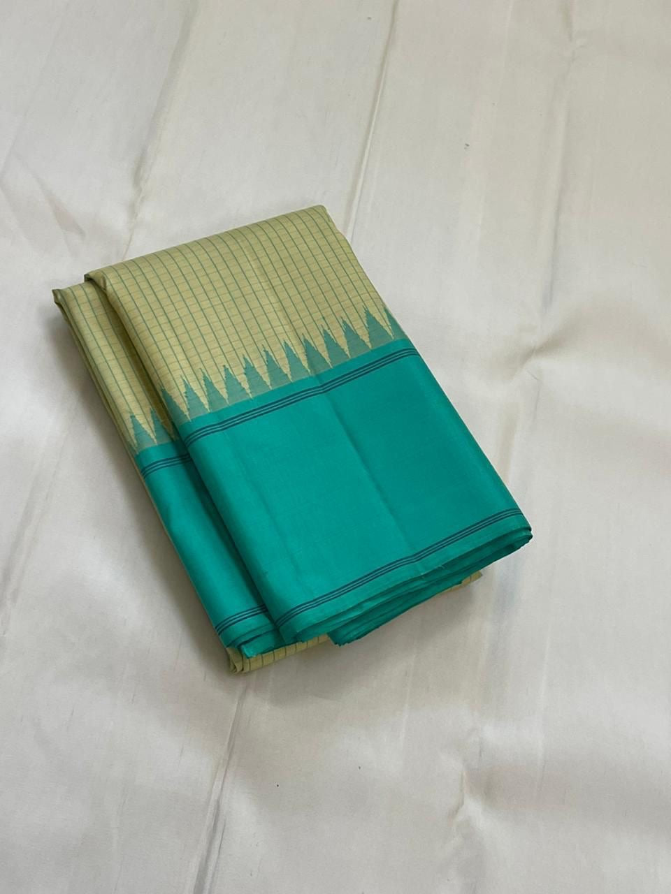 Cardamom Mist & Sea Green Kattam – Pure Silk Kanchipuram Saree ✨ Handwoven Pure Silk with Sea Green Body & Cardamom Checks ✨ Minimalist Korvai Border with Temple Motifs ✨ Contrast Pallu with Subtle Zari Highlights ✨ Silk Mark Certified, ships in 2 weeks