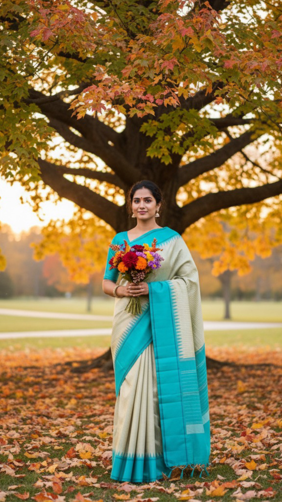 - Pallu: Sea-green pallu with fine zari line work (rettai/stripe style)