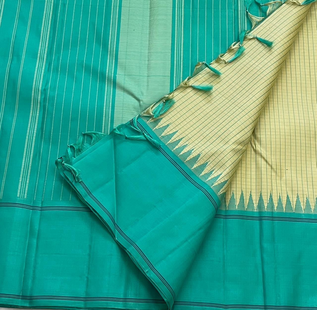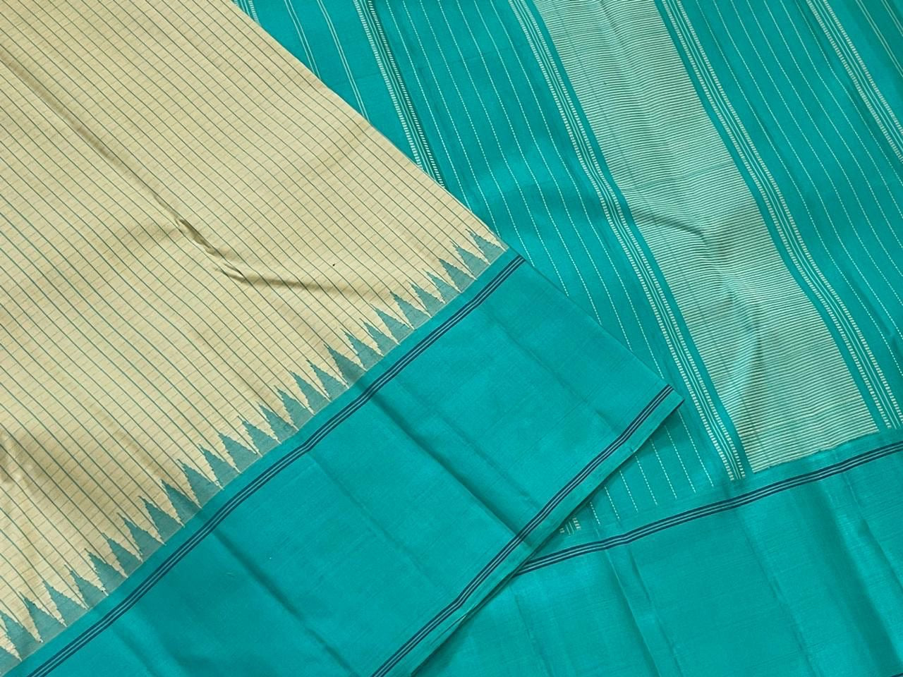 A serene korvai beauty in a rare palette. The body comes in cardamom mist beige with delicate oosi kattam (needle-thin graph checks) in soft teal. Contrasting sea-green korvai borders hold a neat temple (gopuram) tooth join, leading into a graceful striped zari pallu. Finished with a matching sea-green blouse piece with zari border—elegant, airy, and timeless.