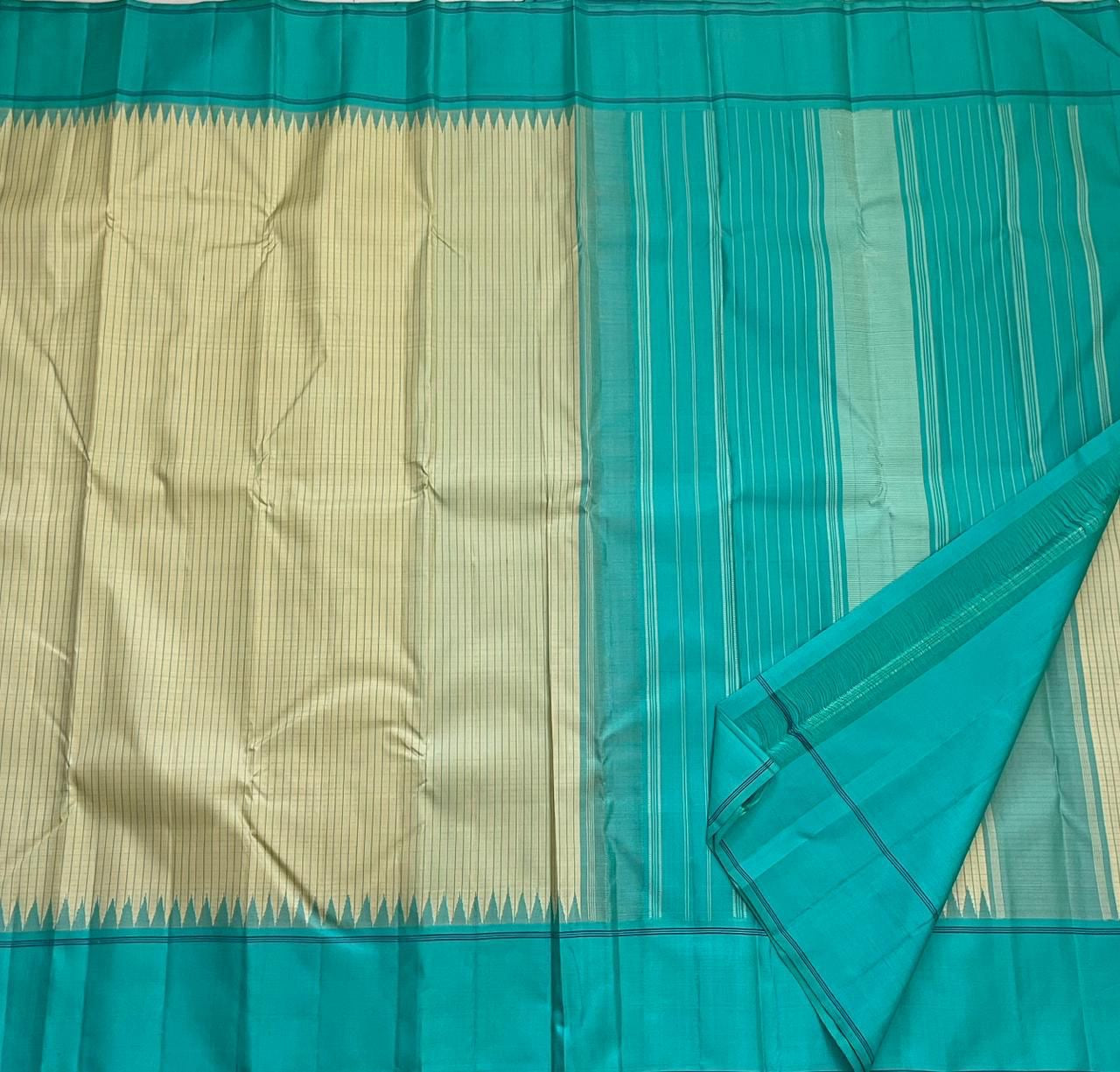 - Borders: Solid sea-green with twin kaddi lines & temple edging