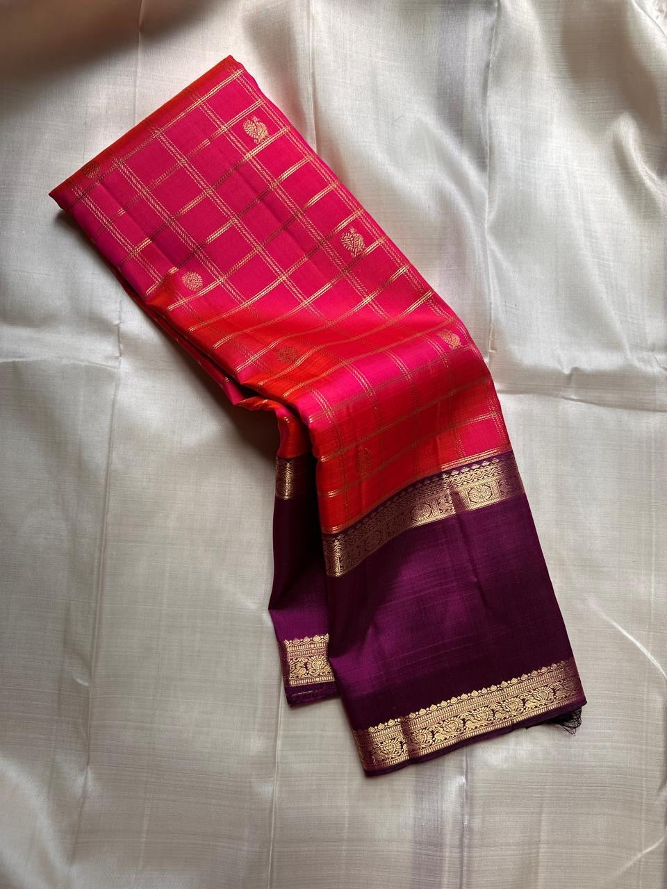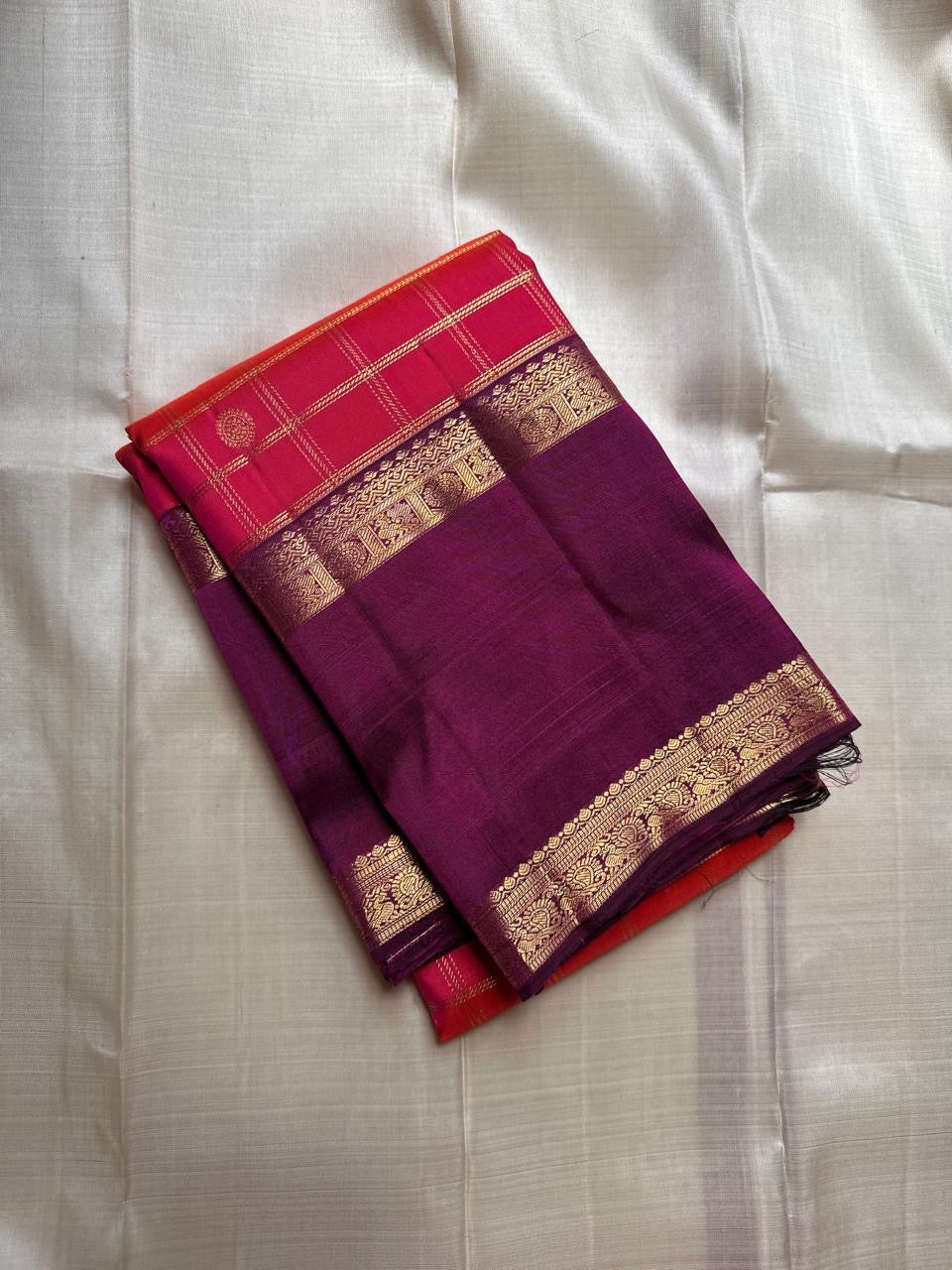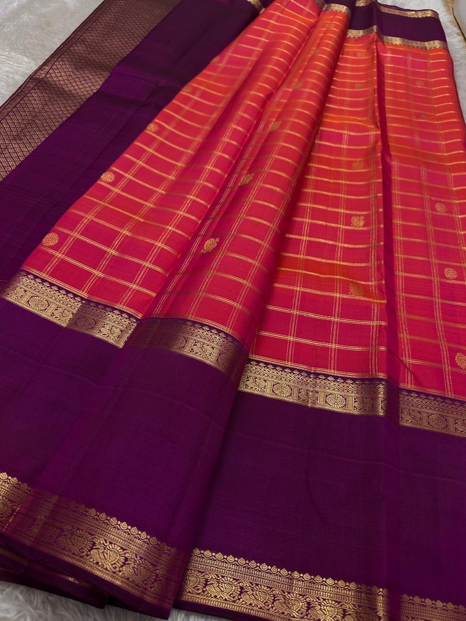 A vibrant rani-pink body with a warm orange shot, woven in classic kattam (grid) checks and scattered gold zari buttas—a lively, festive canvas that catches the light beautifully.