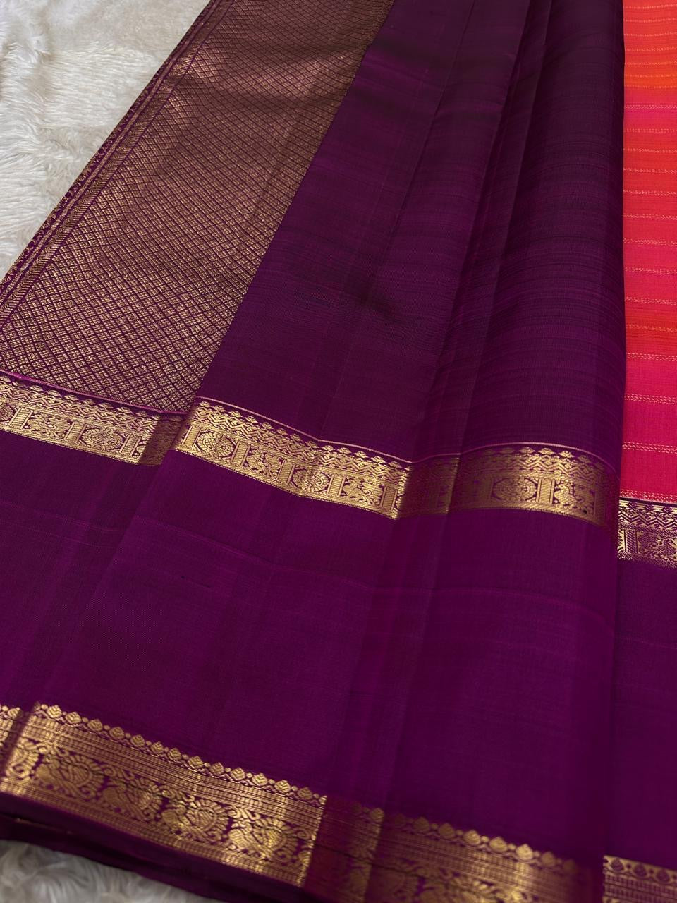 Contrasting deep plum korvai border embellished with rich gold zari—floral vines and medallion detailing—adding regal weight and definition to the drape.