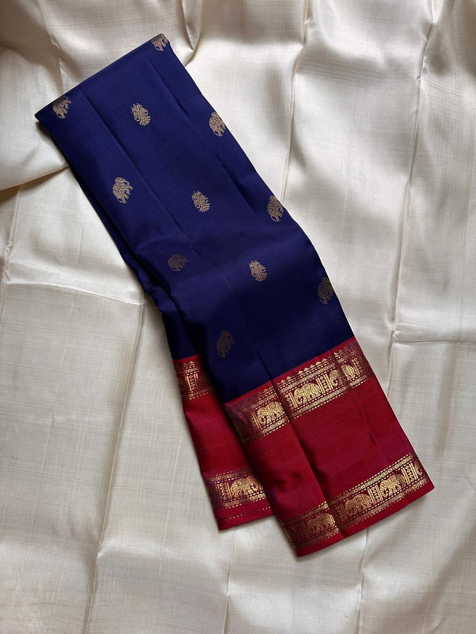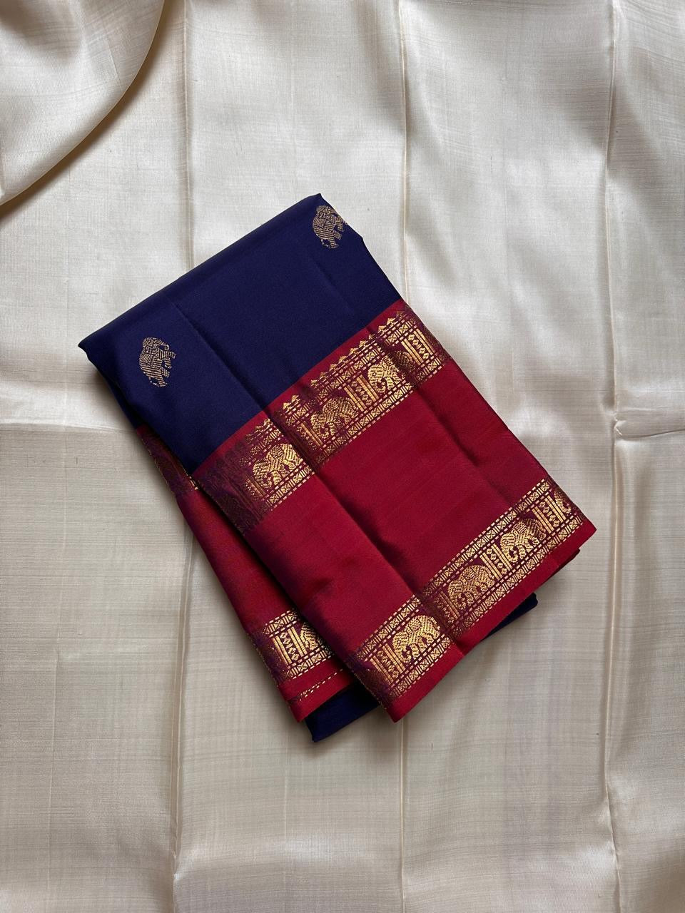 Meta Description: Pure Silk Kanchipuram in navy with gold elephant buttas, maroon korvai borders, and Gandaberunda zari panels. Silk Mark Certified. Free USA shipping. Ships in 1 week.