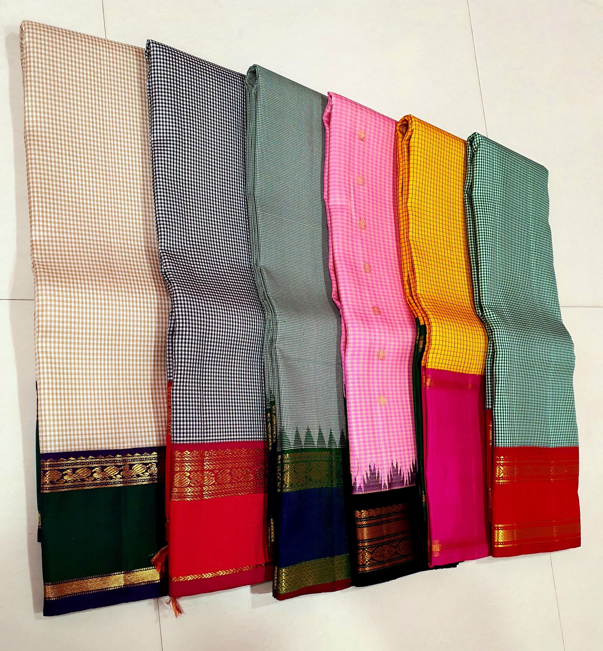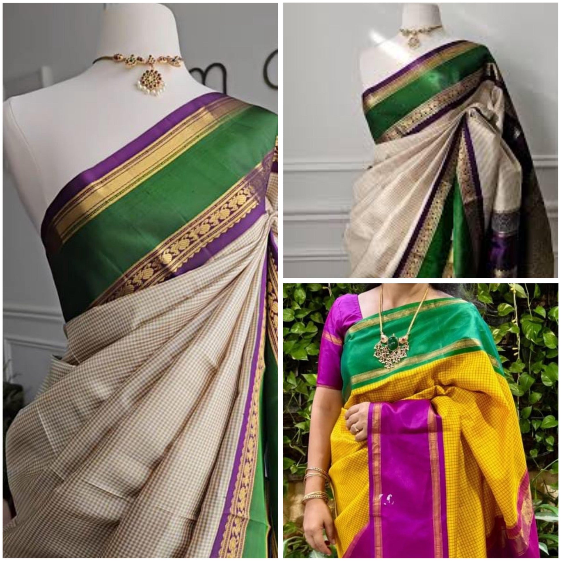 - Body: Bright manjal/yellow with neat micro grid checks (podi kattam)
