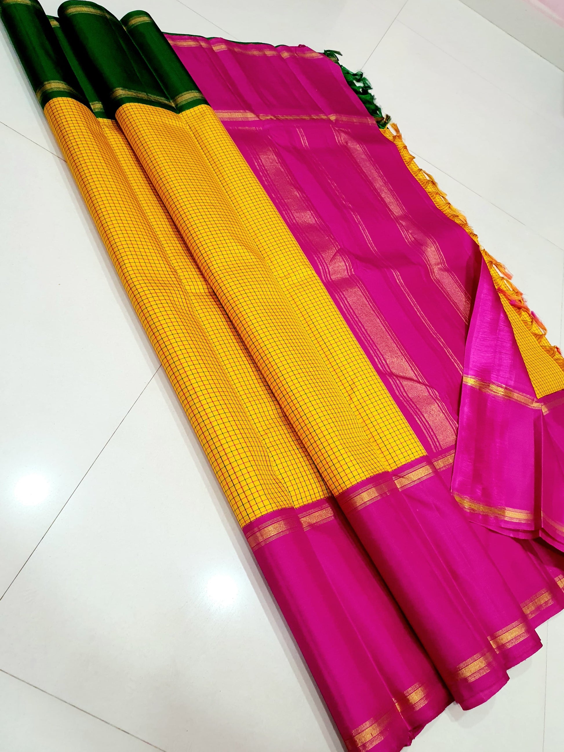 View compareManjal Rani Podi Kattam – Pure Korvai Kanchipuram Silk Saree Sunshine yellow micro checks body with rani pink korvai border & pallu Elegant bottle-green top border and gold zari detailing for a classic finish Silk Mark Certified | ships in two weeks