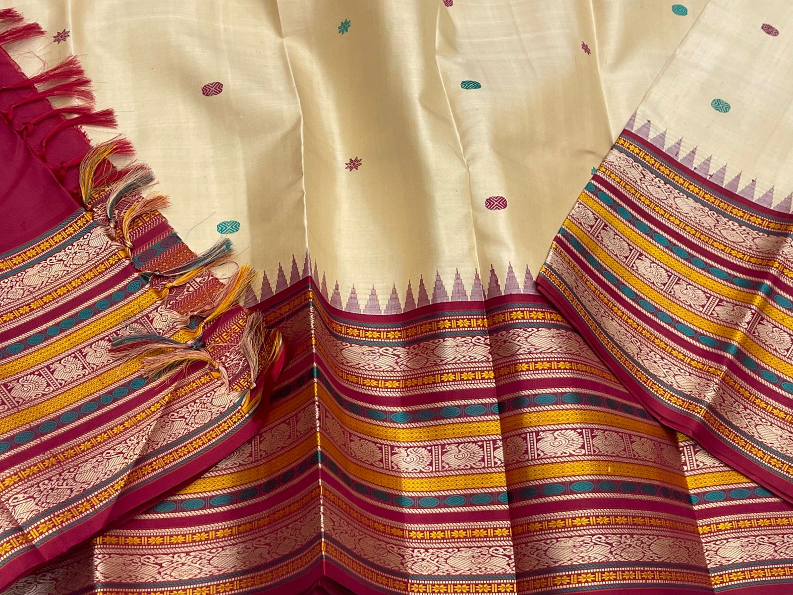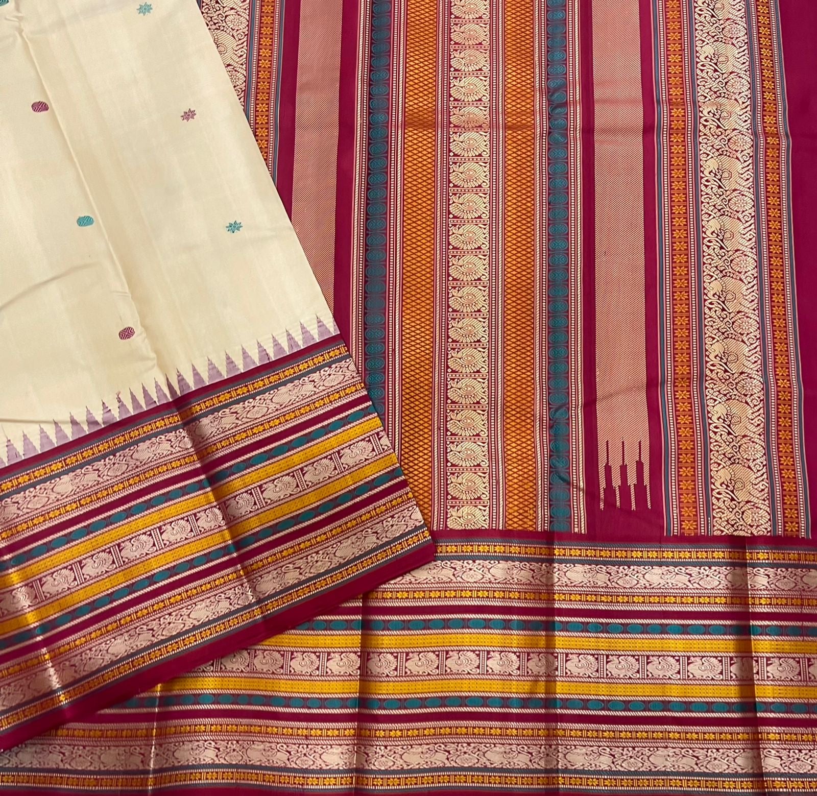 Pari Silk Thread Weaving — Pure Silk Kanchipuram Ivory body with multi-color silk thread buttas (teal, wine & magenta) Korvai contrast wine-magenta borders with vintage thread stripe panels Temple gopuram inner edge & grand pallu in handwoven silk thread