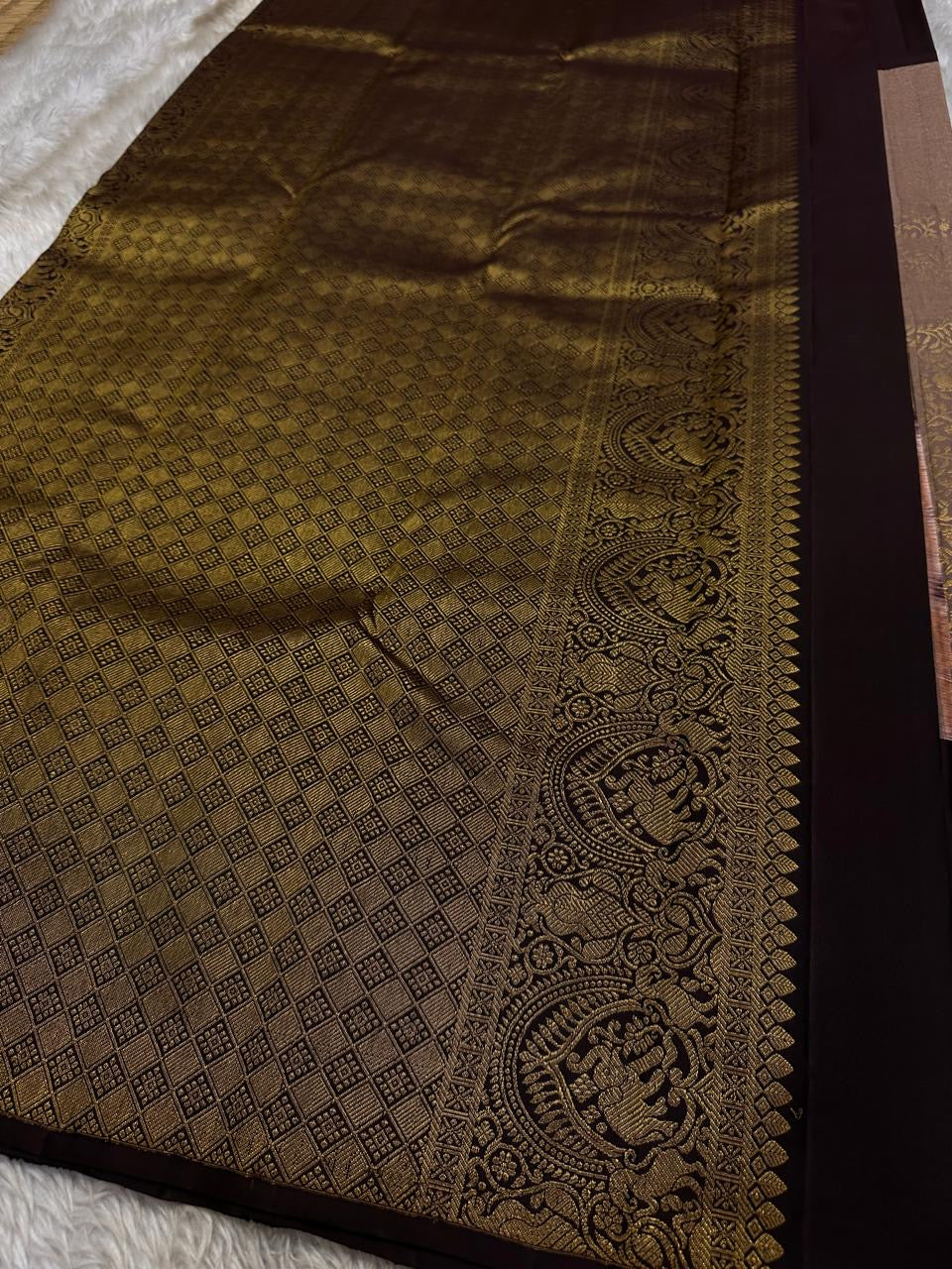 - Borders: Broad antique-gold zari with diamond kattam and traditional motifs