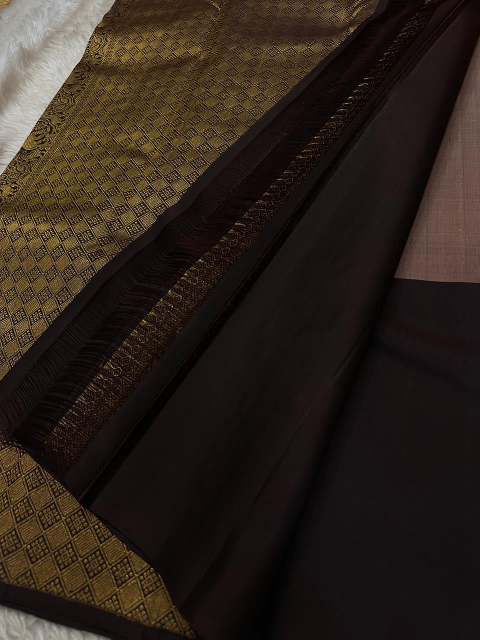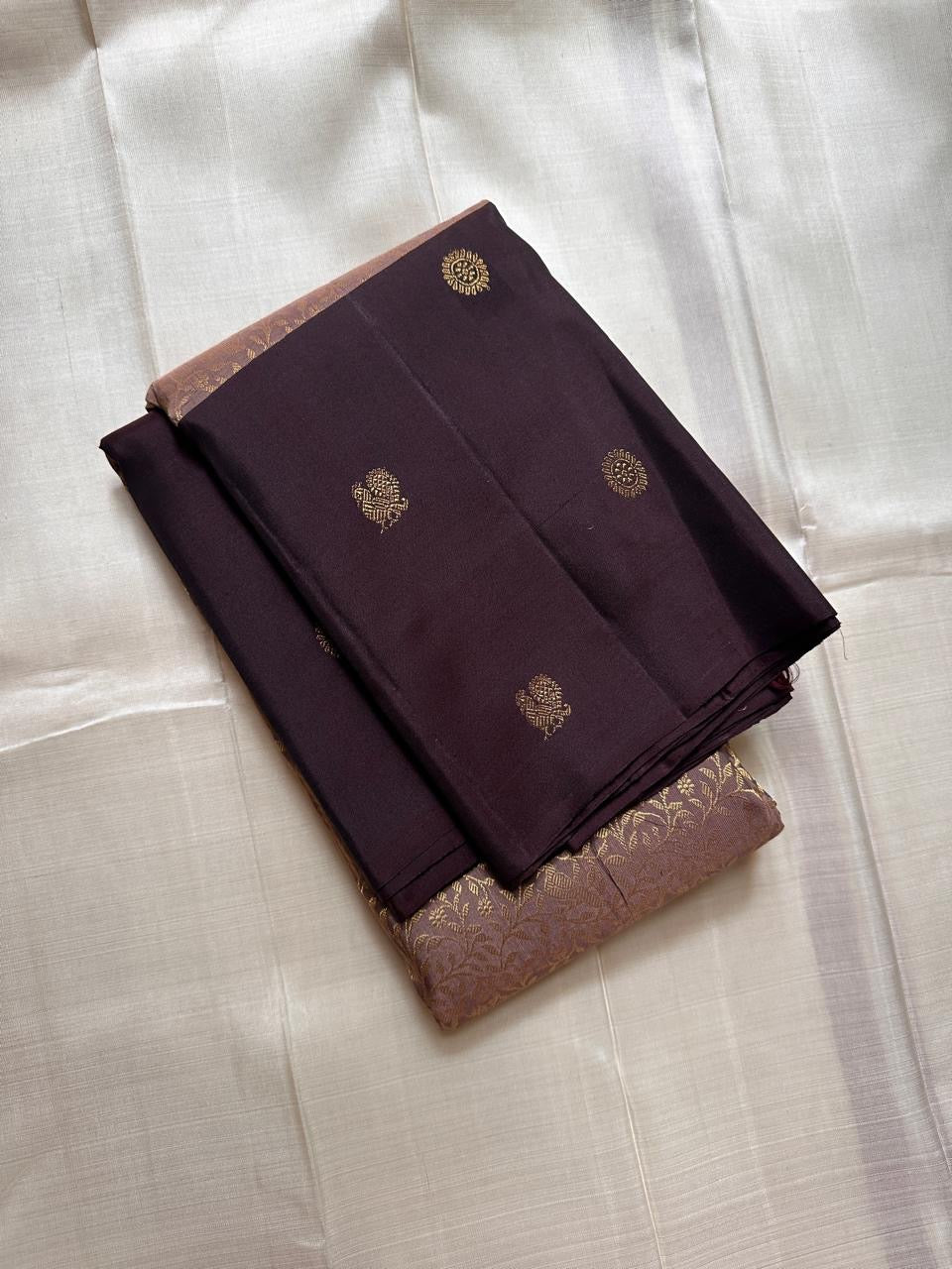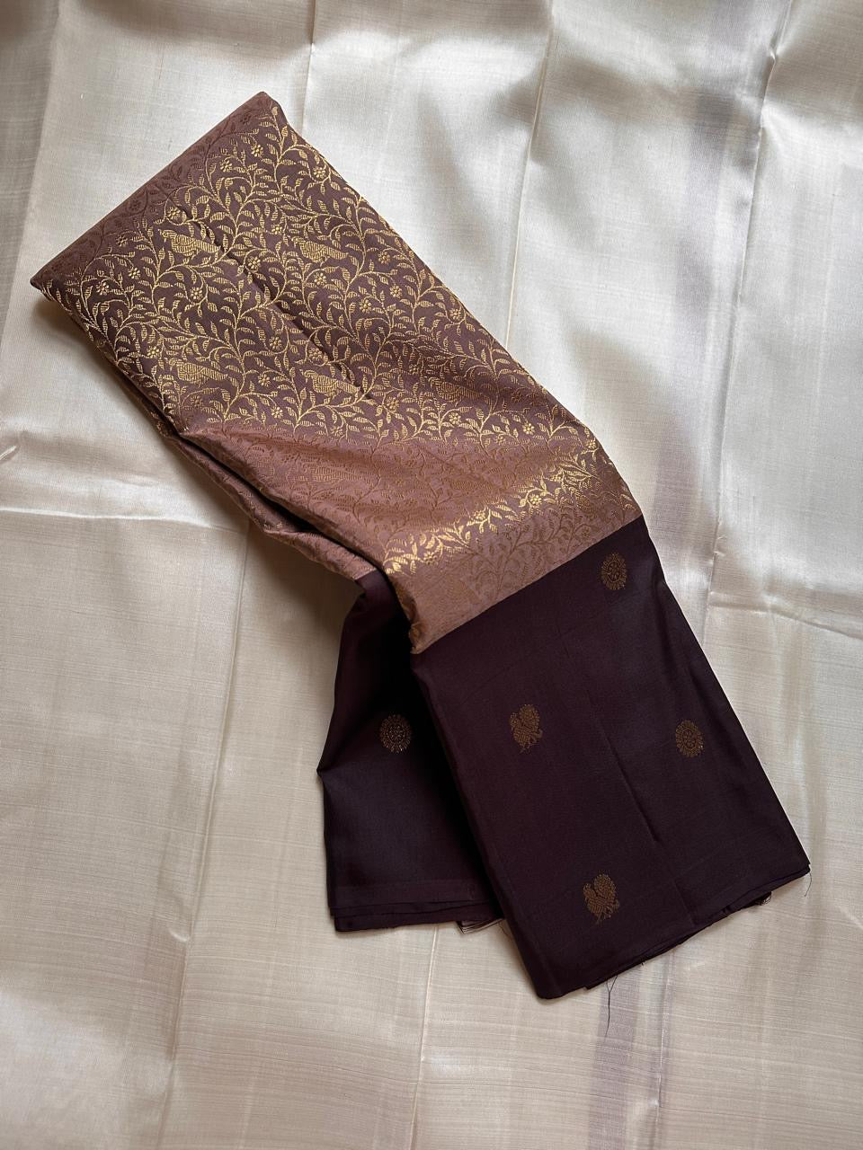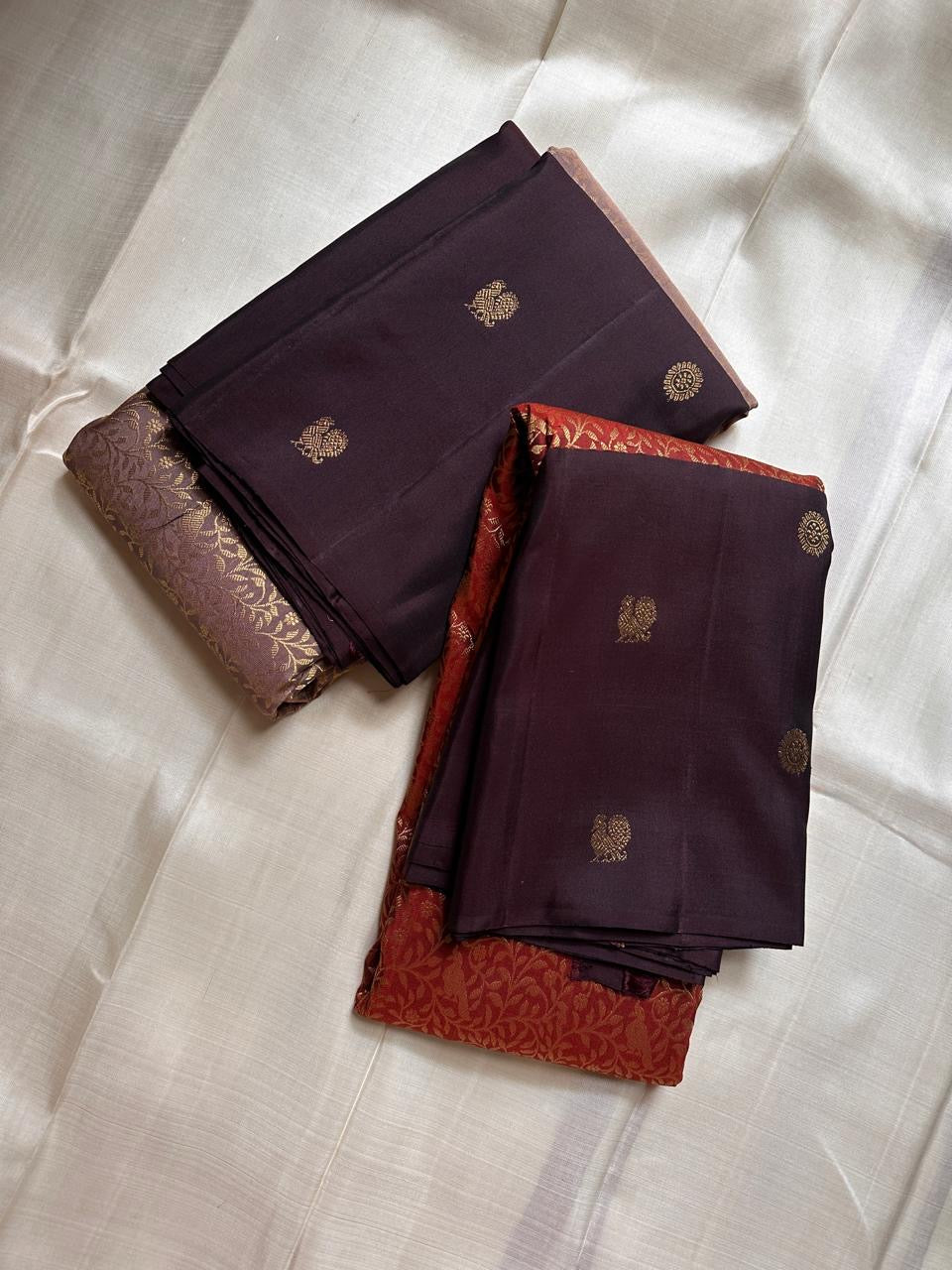 Mauve Mayil – Pure Kanchipuram Silk Saree with Plum Body & Dusty-Rose Pallu Deep plum silk adorned with delicate golden buttas. Broad antique zari borders with kattam. Dusty-mauve pallu in intricate vine jaal. Silk Mark Certified, delivery in 2 weeks