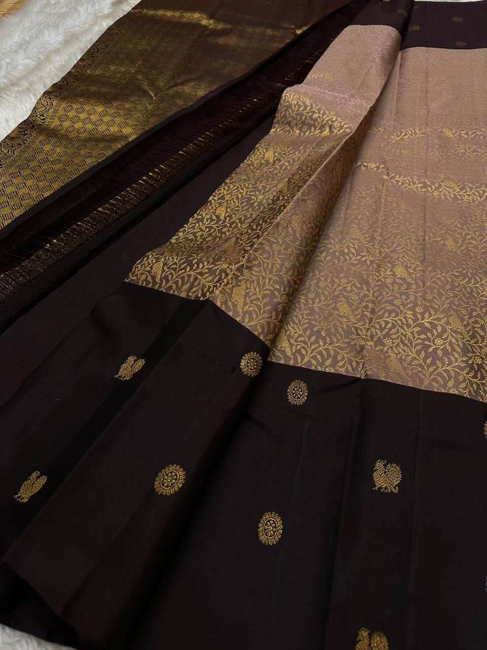 A rich plum silk body adorned with delicate gold rosette and paisley buttas meets a graceful mauve pallu blooming with intricate zari vine jaal. The saree is anchored with a broad antique-gold zari border, finely woven with diamond kattam and heritage motifs, echoing the timeless majesty of a peacock – the Mayil.