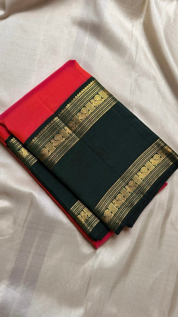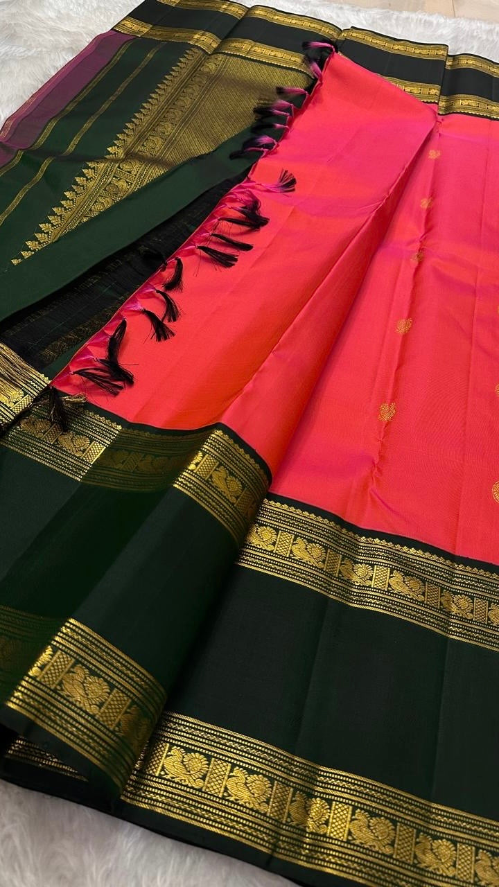 Pure silk kanchipuram handloom saree with tomato pinkish orange body mayil floral butta green border intricate pallu