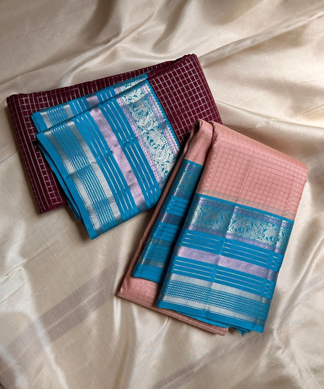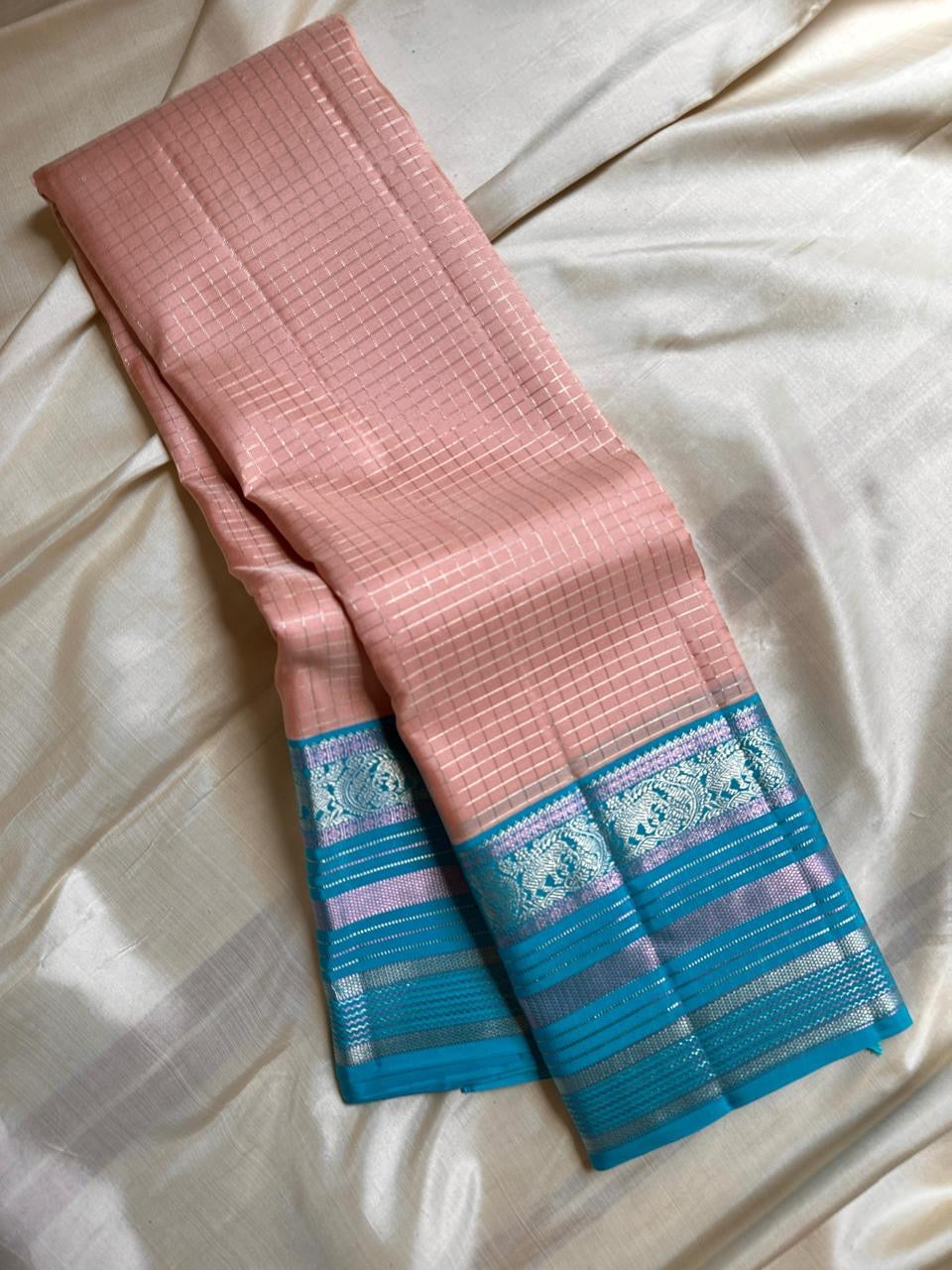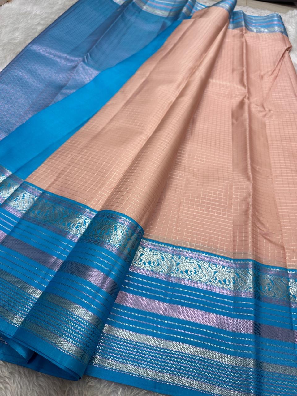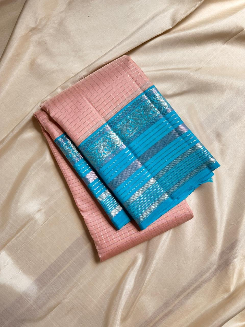 Powder Rose Neelam — Pure Silk Kanchipuram Saree Powder-rose body with zari kattam checks ✨ Contrast ocean-blue korvai border & lilac-silver zari pallu 🌊 Handloom elegance for festive Diwali celebrations 🪔 Silk Mark Certified • ready to ship