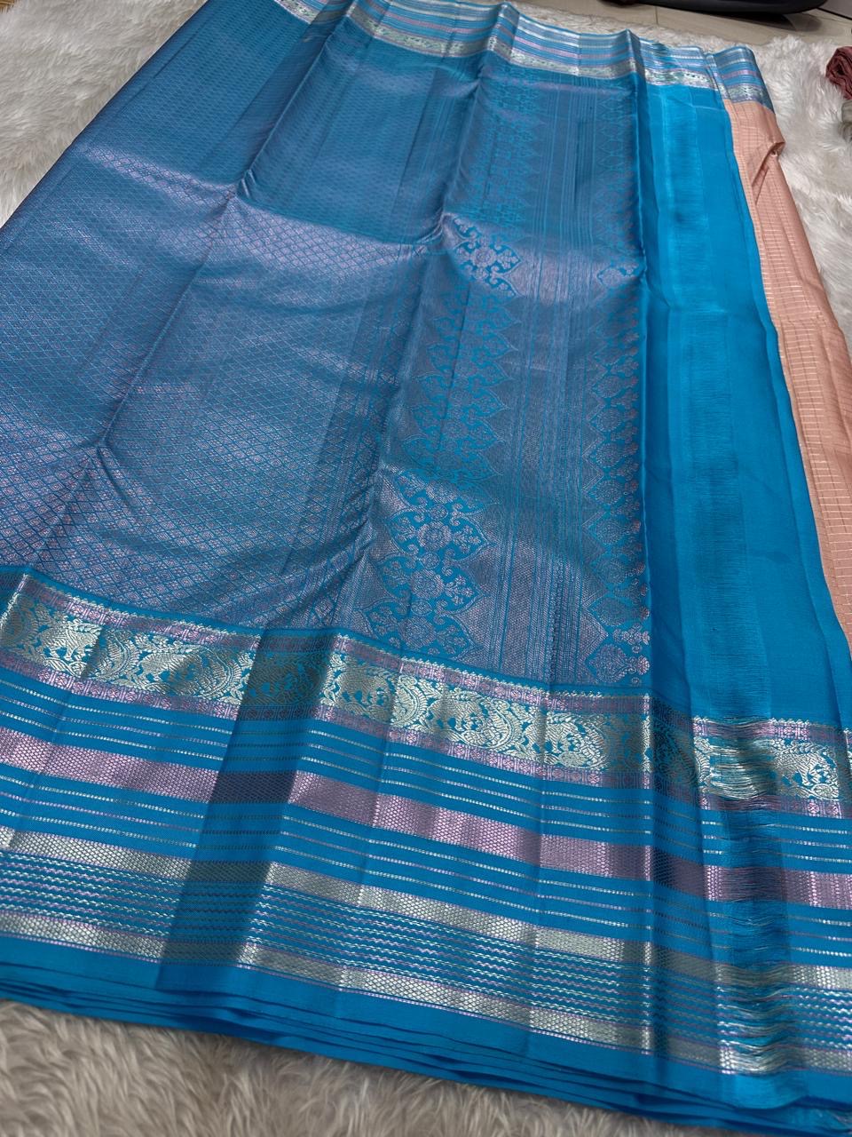 The Powder Rose Neelam is a graceful blend of soft romance and ocean depth. Its powder-rose body is delicately adorned with micro kattam zari checks, flowing seamlessly into a luminous neelam-blue border and pallu. Silver zari shimmers with lilac undertones, bringing alive motifs of vines, waves, and stripe brocades—perfectly balanced for timeless festive elegance.