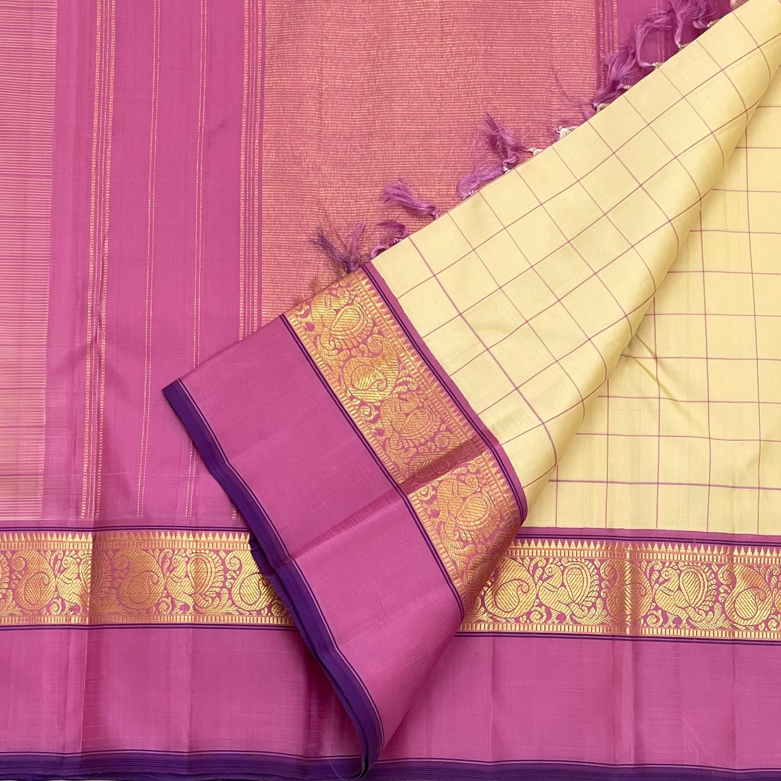β€’ Body: Soft butter-cream (ivory-vanilla) field laid with neat rose-pink kattam checks; gentle lustre, crisp hand.