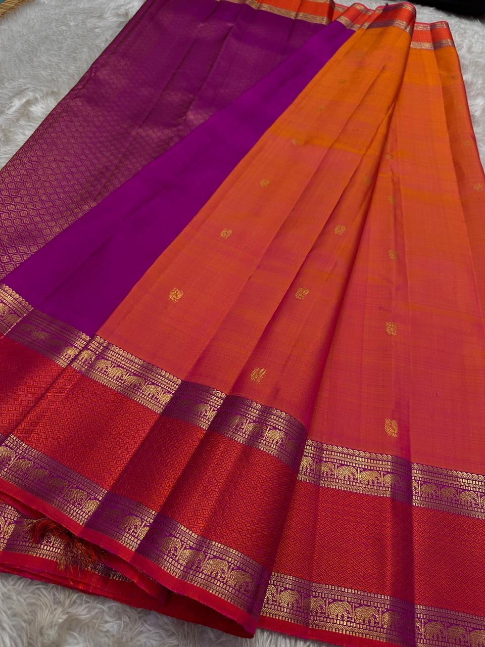 View compareKumudham — Pure Silk Kanchipuram Saree Aruna-pink shot orange body • Maroon gopura temple borders • Violet diamond brocade pallu ✨ Silk Mark Certified • Free USA Shipping • Ships in Two Weeks ✅