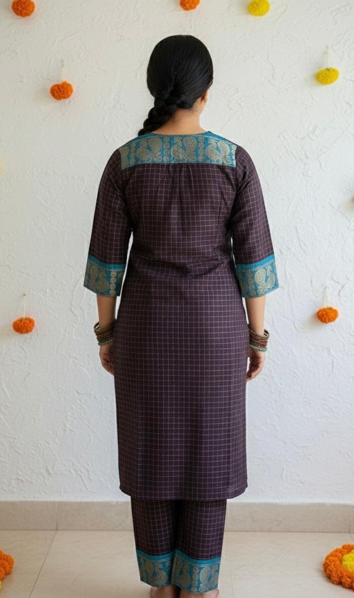 Vanappu — Jamun & Aqua Sungudi Zari Kattam Kurti Set Deep Jamun Purple Handspun Cotton with Aqua Zari Mayil Borders & Kattam Checks ✨ Handwoven in Madurai • Fully Lined • Free USA Shipping • Ready to Ship ✅