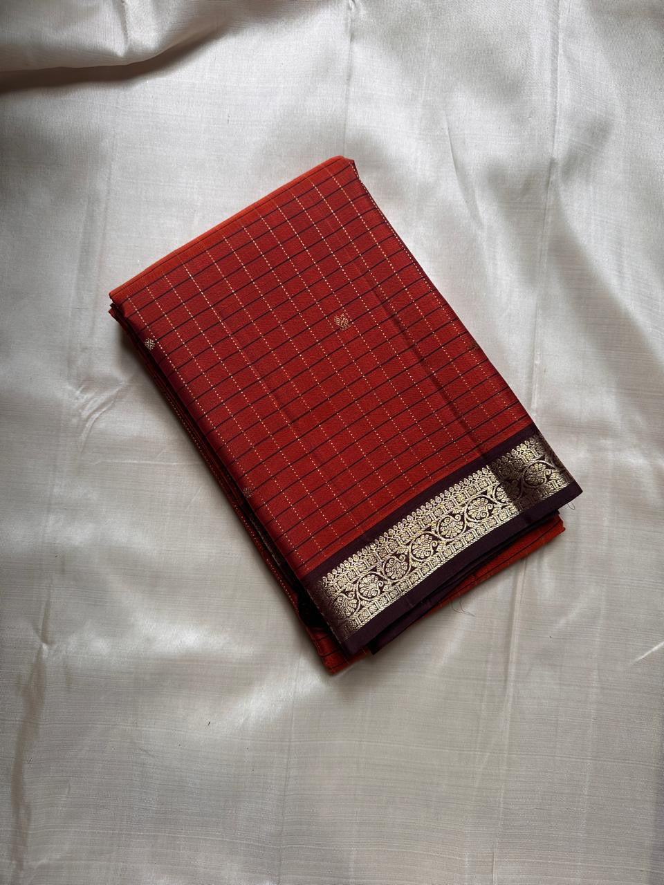Terracotta Temple – Pure Kanchipuram Silk Saree Brick red body with fine zari grid checks & golden buttas ✨ Deep coffee-maroon borders and grand diamond-jaal pallu in antique gold.