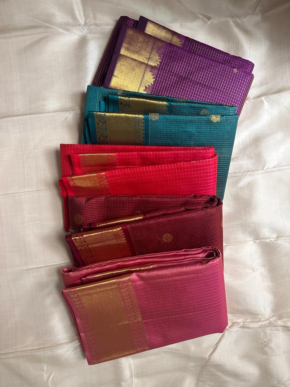 • Blouse: Matching lotus rose blouse piece with gold checks and coordinating border – ideal for elbow sleeves, kemp jewellery looks or bridal necklines.