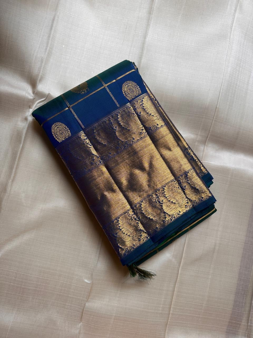 - Body: Peacock blue-green base with woven zari checks and alternating round & mango-shaped buttas.
