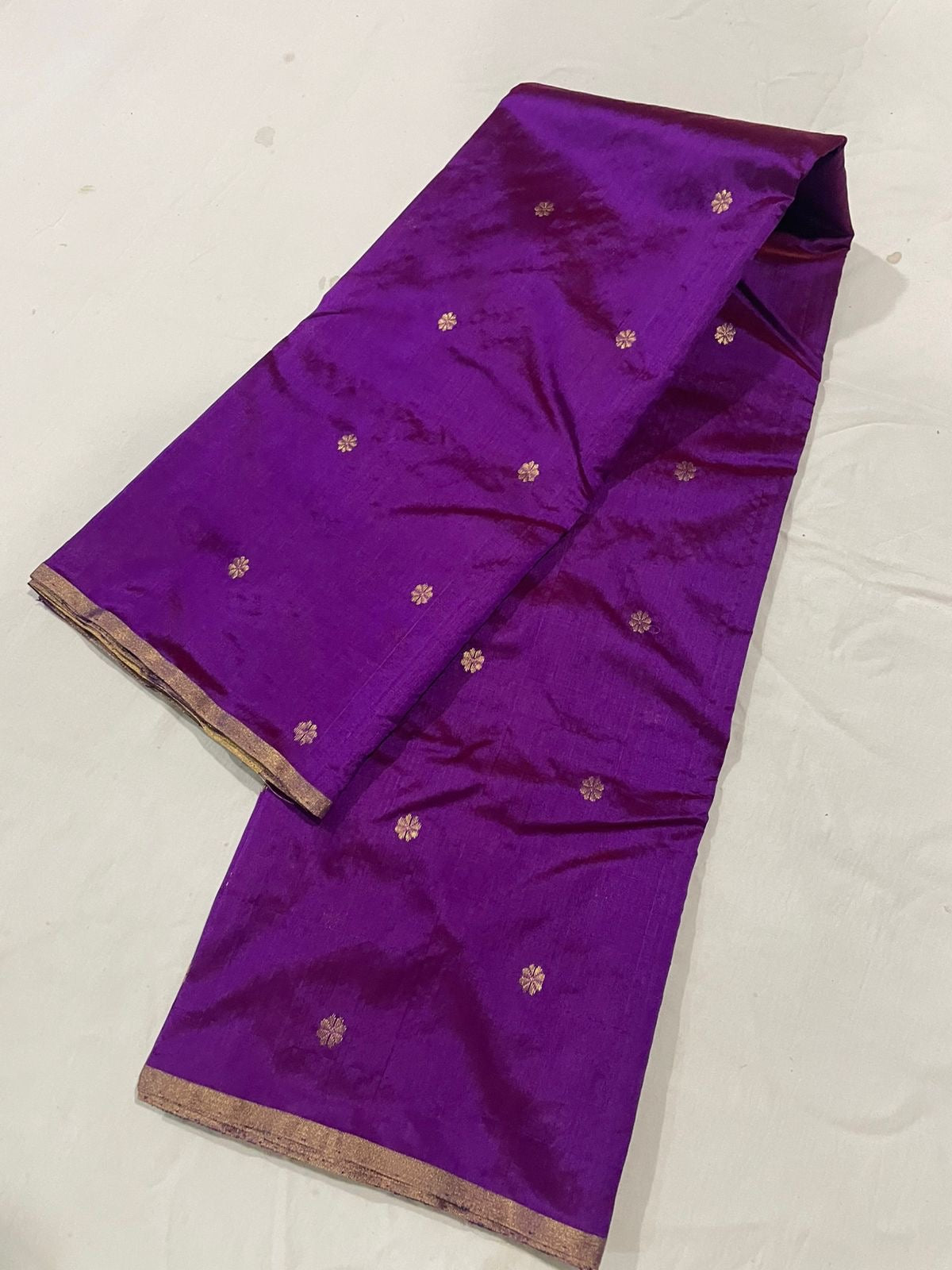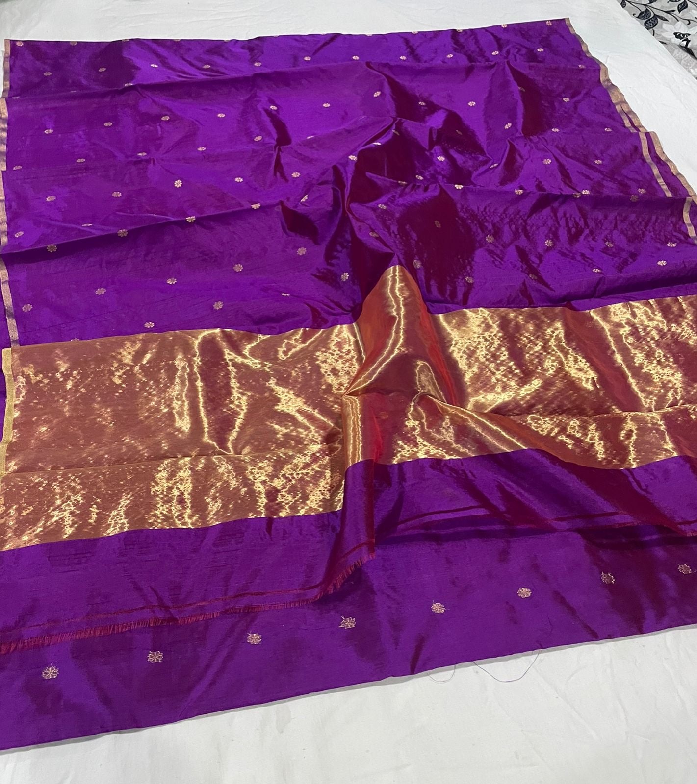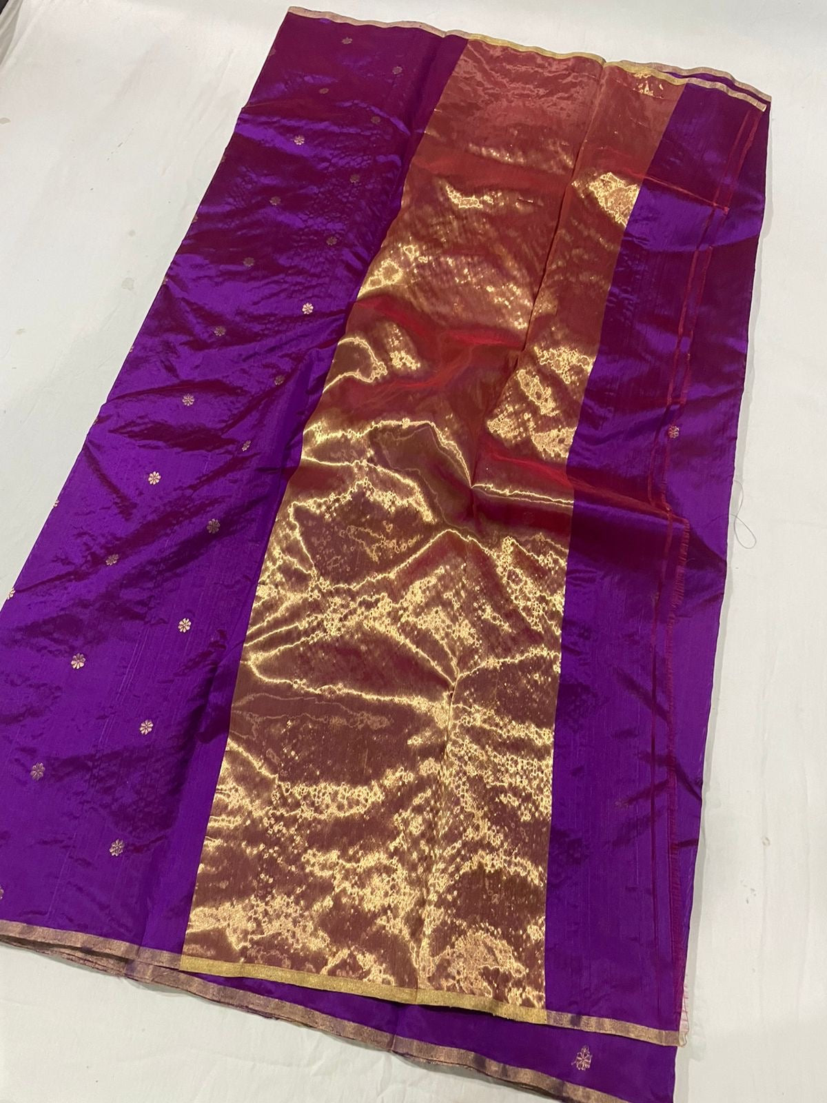 Expertly crafted from pure silk Chanderi, this stunning fabric boasts intricate zari butties, a contrasting selvedge, and a luxurious zari pallu.