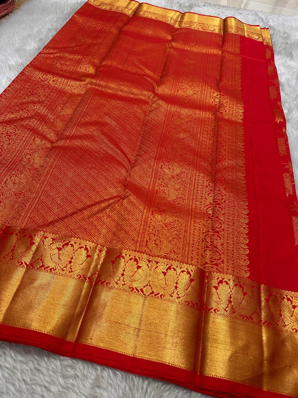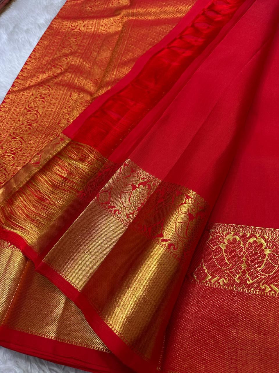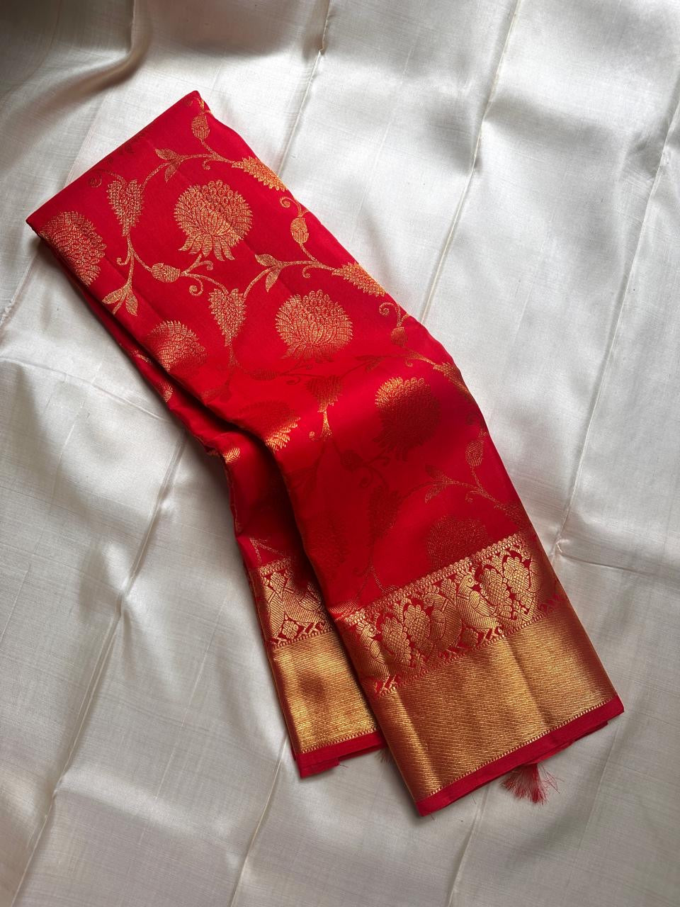 Like freshly bloomed red blossoms at dawn, this saree exudes both warmth and opulence. It is a stunning, heritage piece ideal for Diwali nights, temple weddings, and festive celebrations.