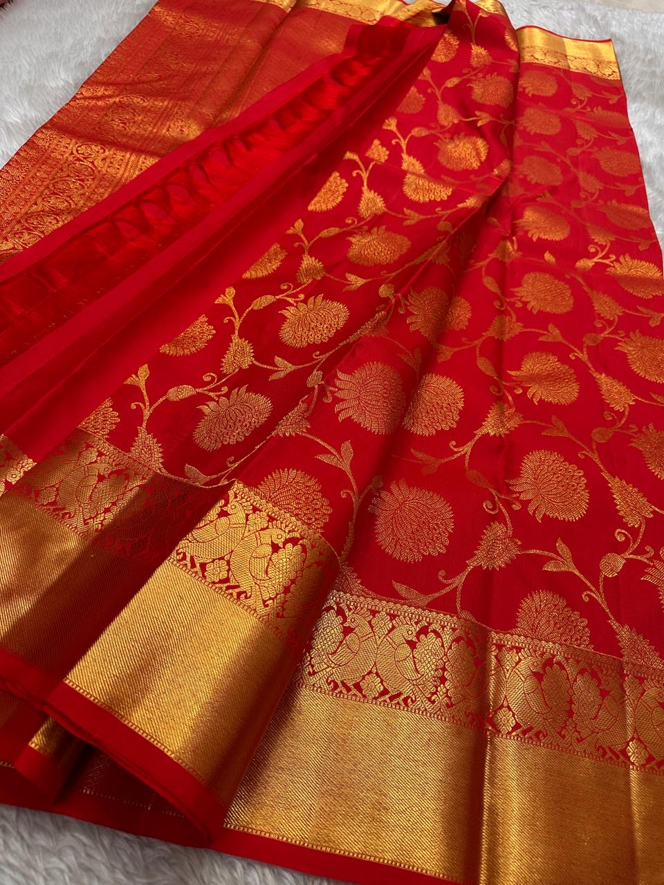 View compareRed Blossom — bright vermillion & Antique Gold Pure Silk Kanchipuram Saree • Floral Jaal & Yali Border Silk Mark Certified • Free Shipping USA • ready to ship