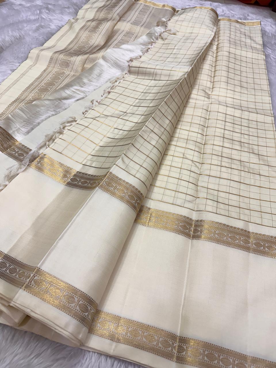 Ivory–cream body with soft swarna (gold) zari kattam checks. Classic antique gold zari borders with coin-vine & geometric brocades. Grand ivory-gold pallu with rich zari weaves & hand-tied tassels.
